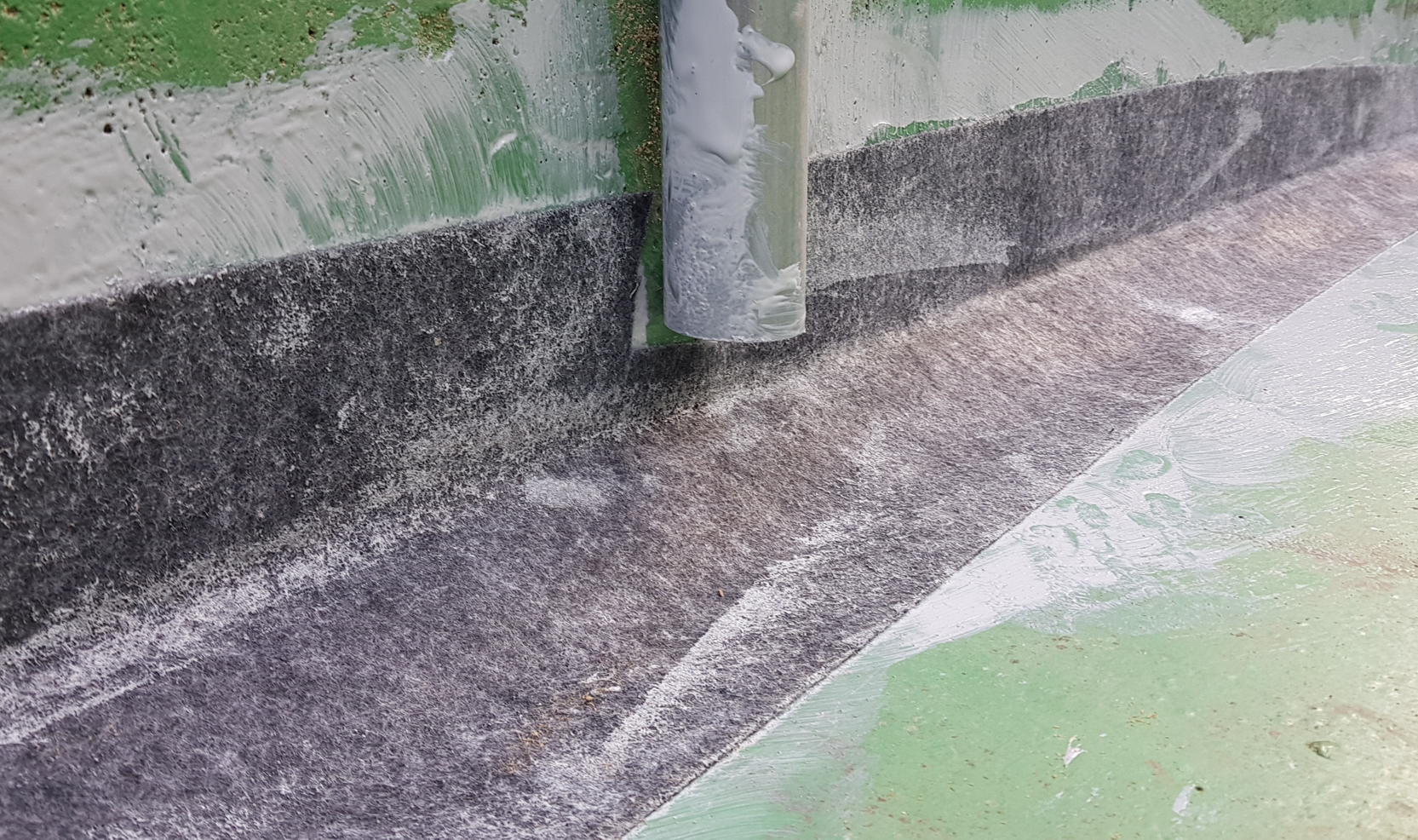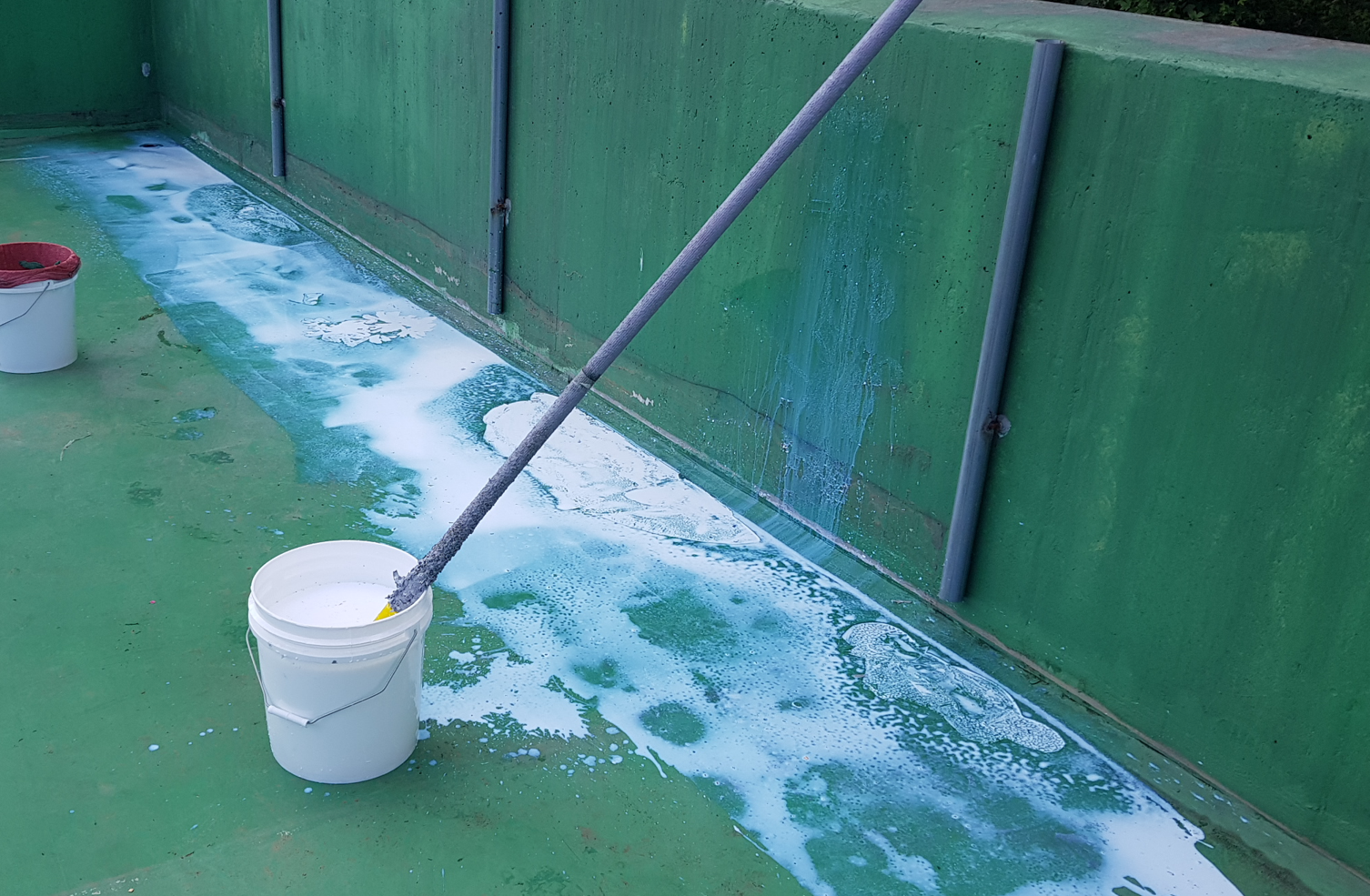 바닥에 부착한 시트가 떨어지게 되면 그 틈으로 누수가 발생하게 됩니다. 이를 막기 위해 시트 위에 전체적으로 침투 방수액을 도포합니다. 침투 방수액은 시트에 스며들어 바닥과 서로 일체화시켜 주는 역할을 합니다. 이 작업을 함침 작업이라고 합니다.