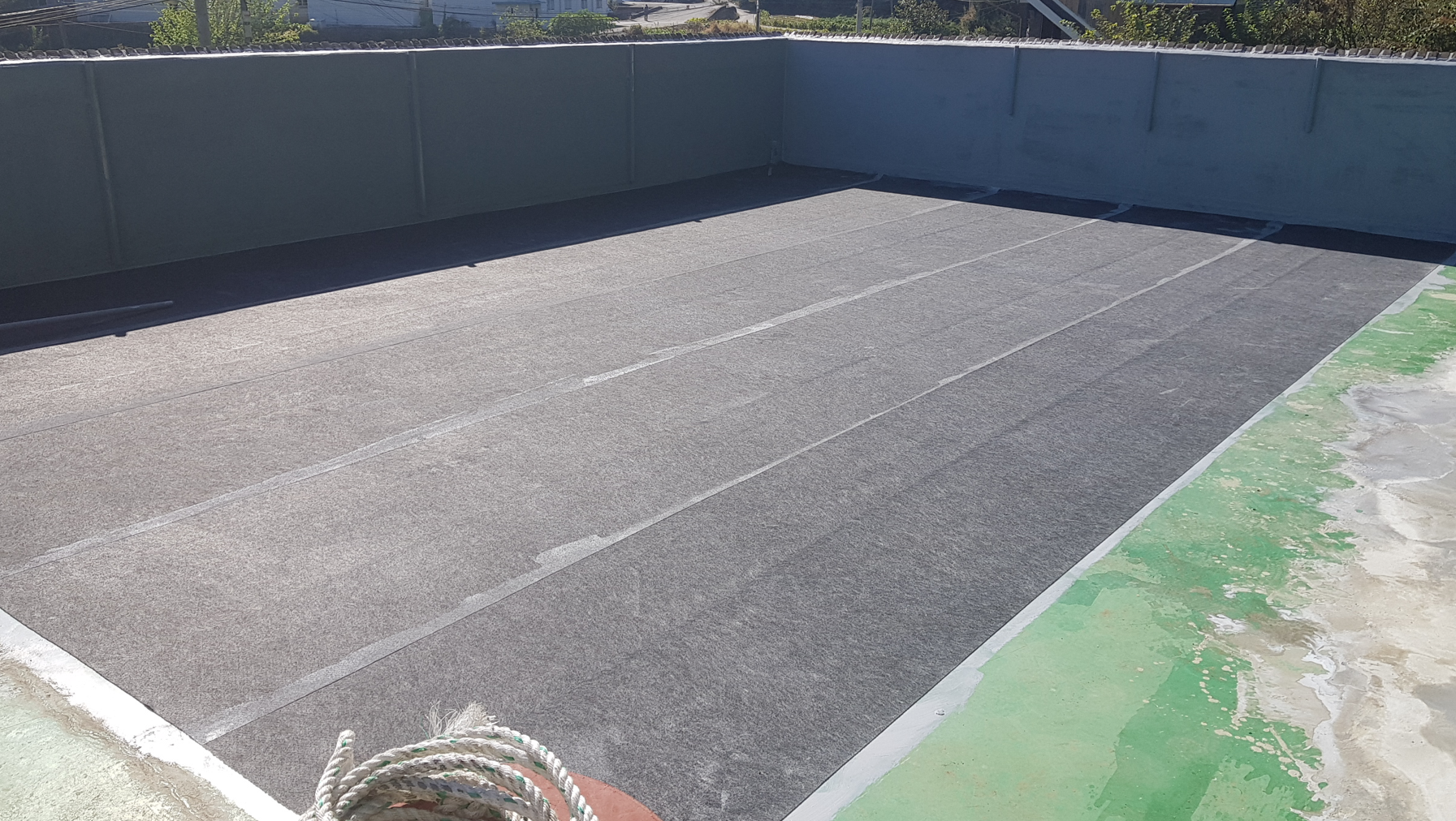 다음은 바닥 전체에 방수시트를 부착합니다. 우레탄으로 잡을 수 없었던 크랙을 고정하기 위한 과정입니다. 방수액을 먼저 칠한 후 시트를 옥상 바닥에 전체적으로 부착합니다. 방수시트는 섬유 재질이기 때문에 크랙이 다시 갈라지지 않도록 고정할 수 있습니다.