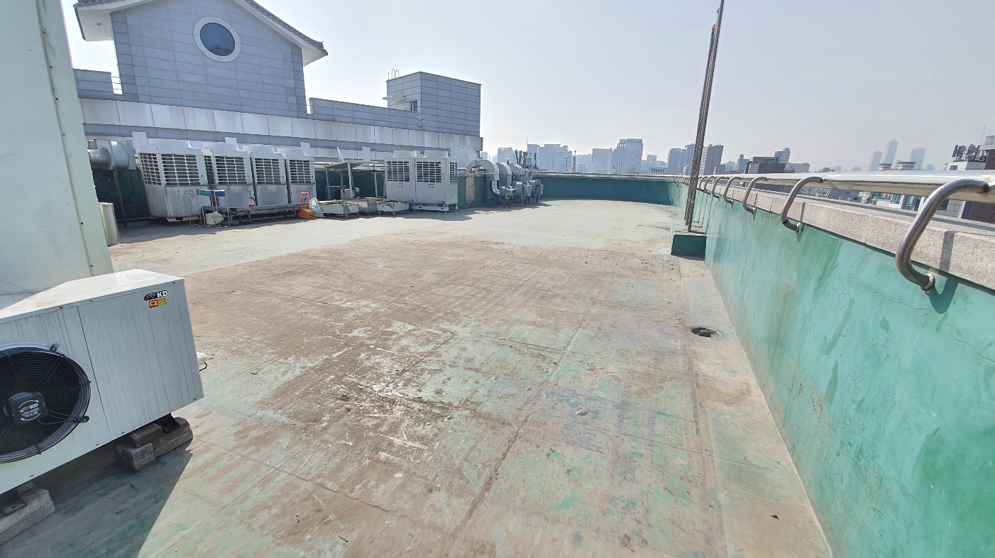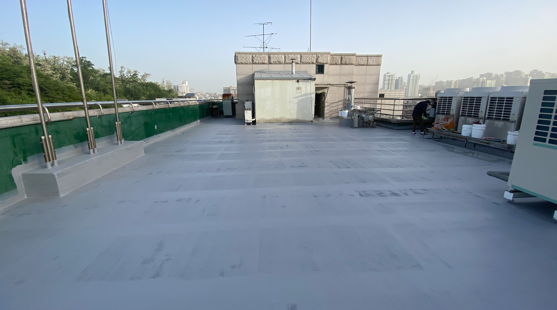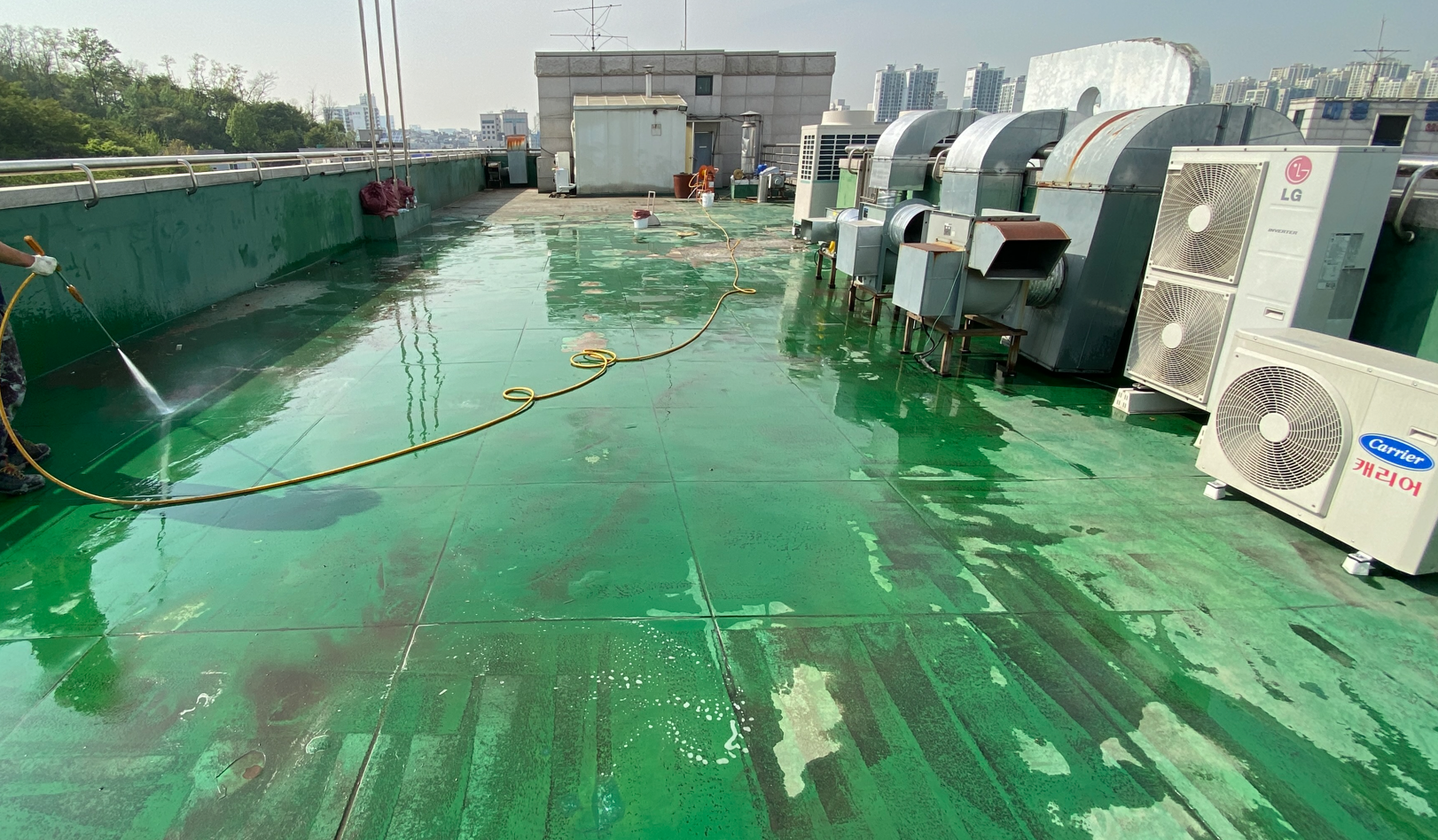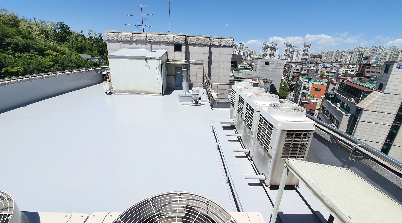 다음으로 물청소 작업을 진행합니다. 옥상에 쌓인 먼지와 이물질을 제거하기 위한 작업입니다. 물청소는 고압 세척기로 작업을 진행하기 때문에 깨끗하게 청소가 가능합니다. 여기까지가 본격적인 시공 전의 밑작업입니다.
