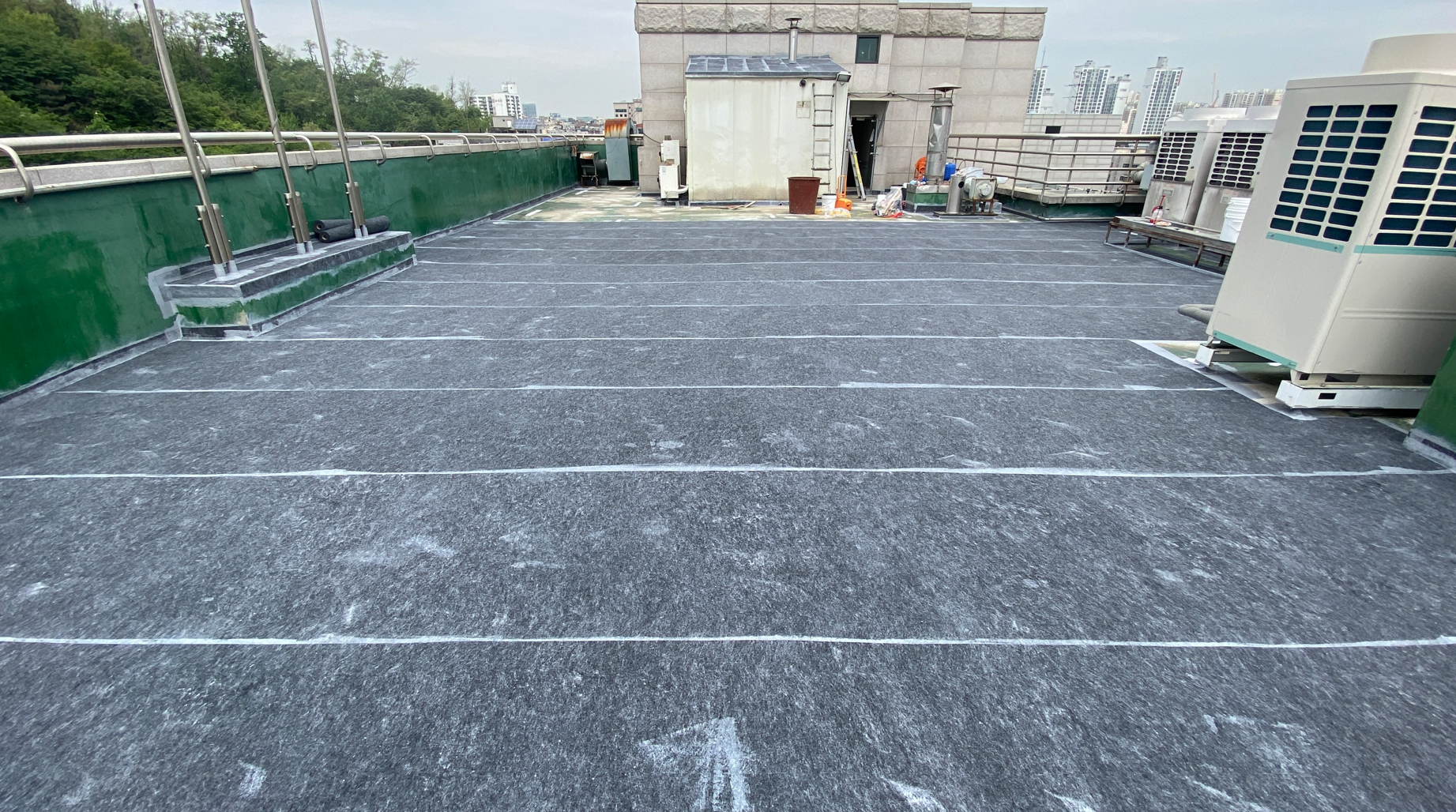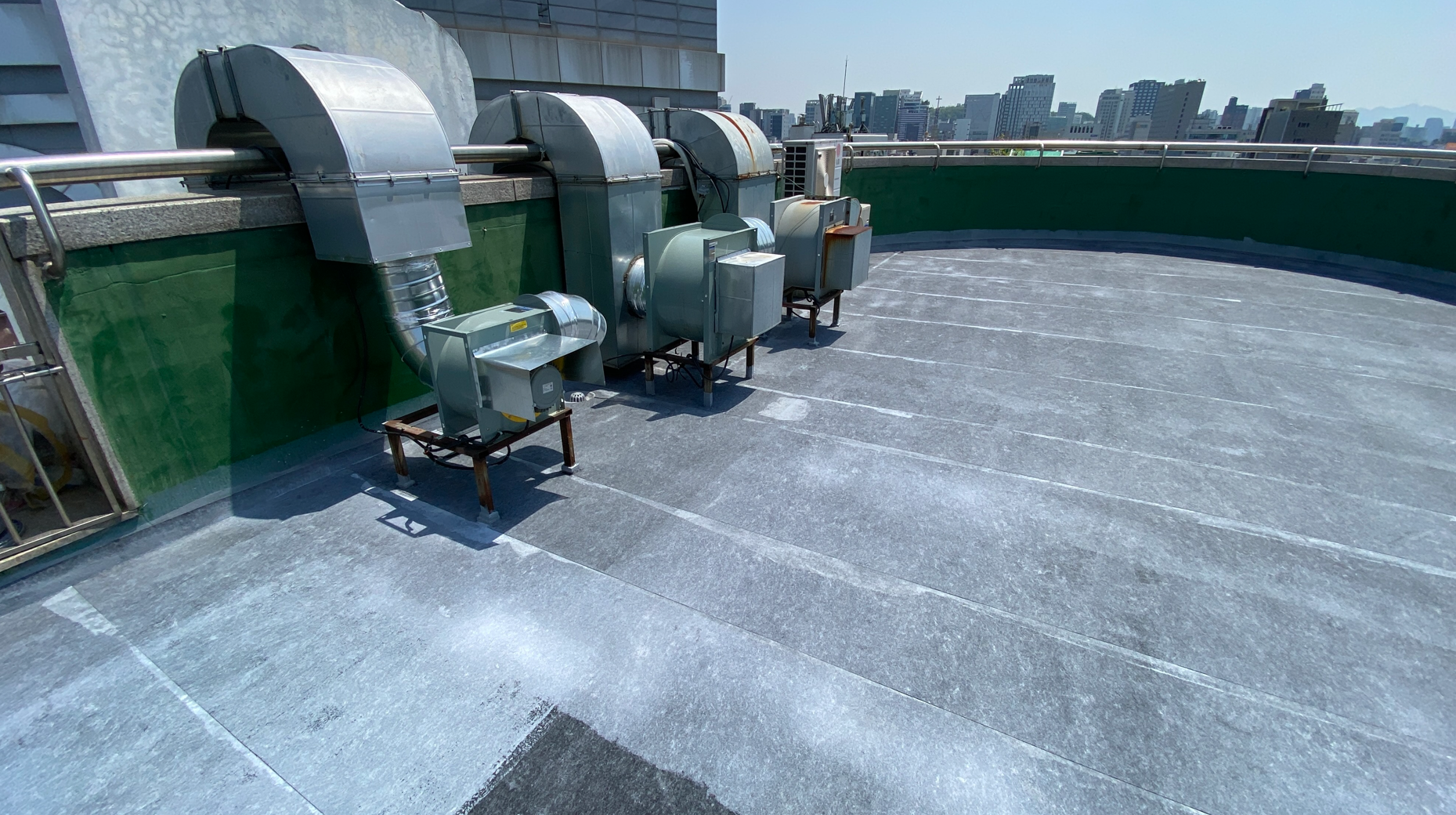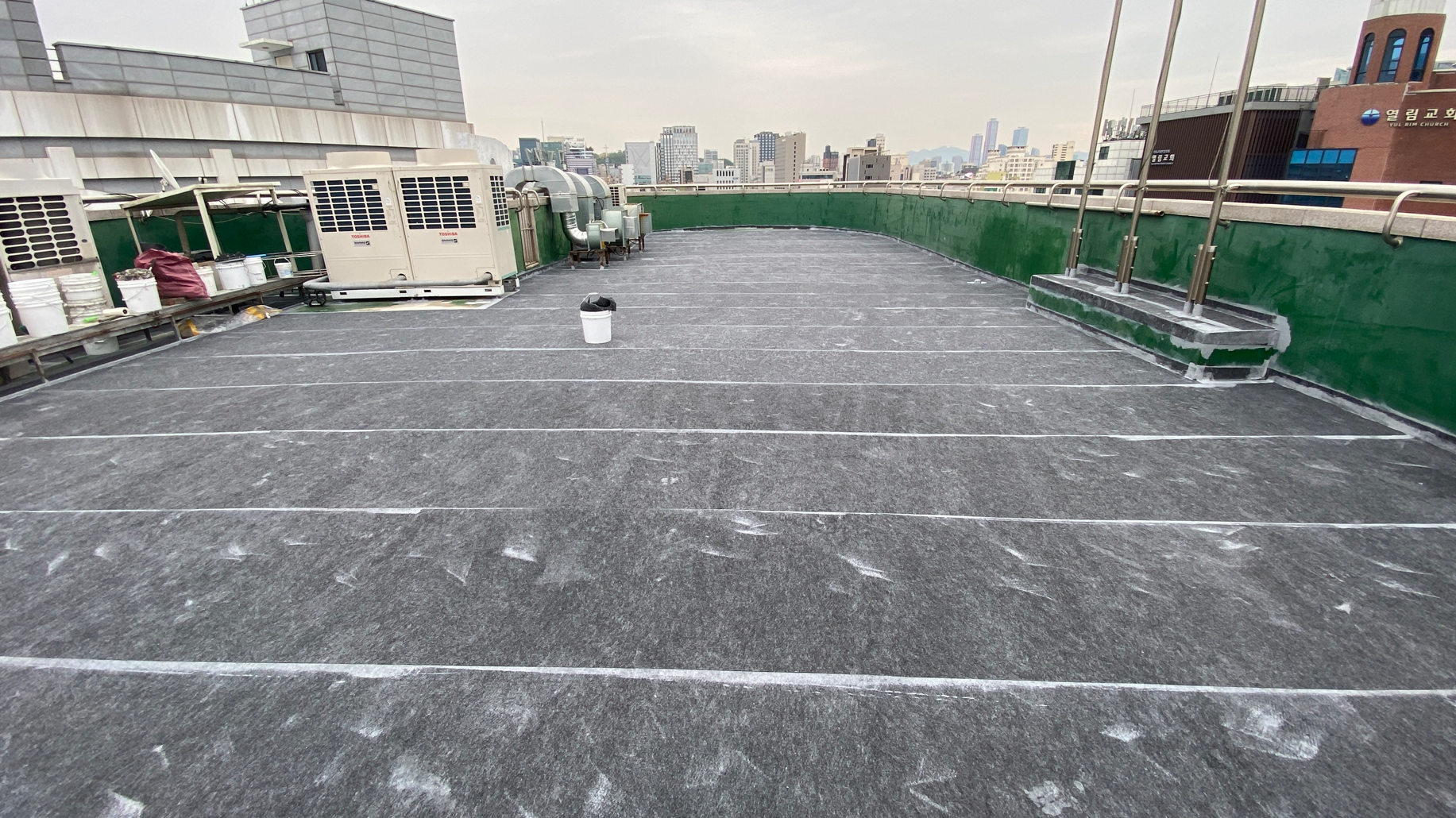 다음으로 물청소 작업을 진행합니다. 옥상에 쌓인 먼지와 이물질을 제거하기 위한 작업입니다. 물청소는 고압 세척기로 작업을 진행하기 때문에 깨끗하게 청소가 가능합니다. 여기까지가 본격적인 시공 전의 밑작업입니다.