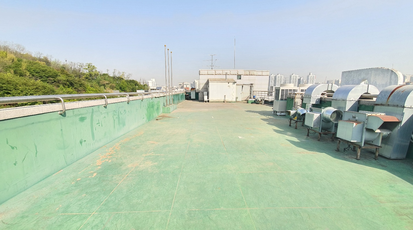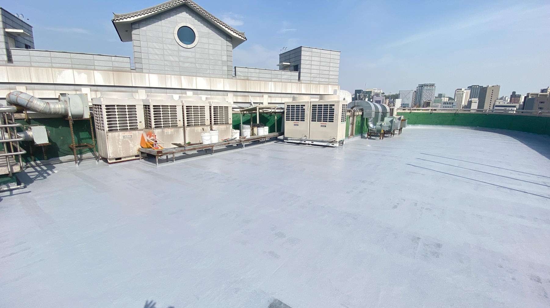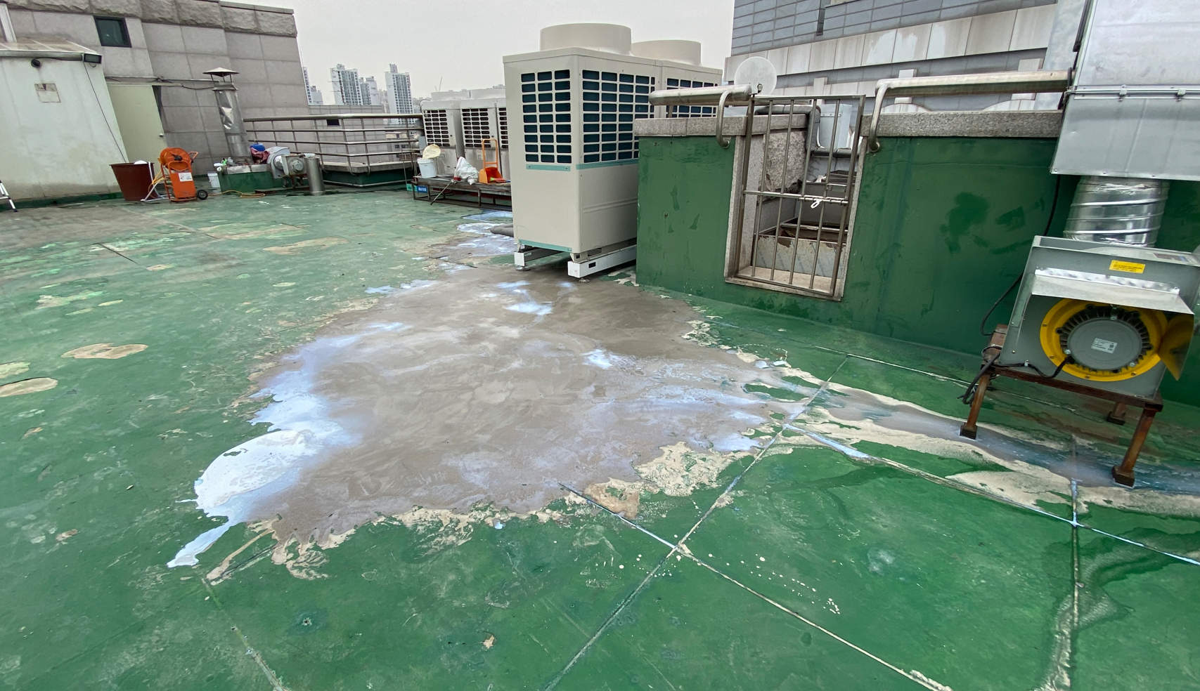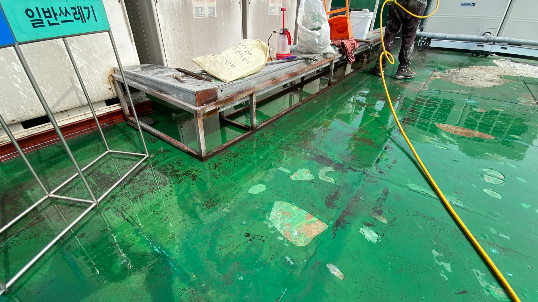다음으로 물청소 작업을 진행합니다. 옥상에 쌓인 먼지와 이물질을 제거하기 위한 작업입니다. 물청소는 고압 세척기로 작업을 진행하기 때문에 깨끗하게 청소가 가능합니다. 여기까지가 본격적인 시공 전의 밑작업입니다.