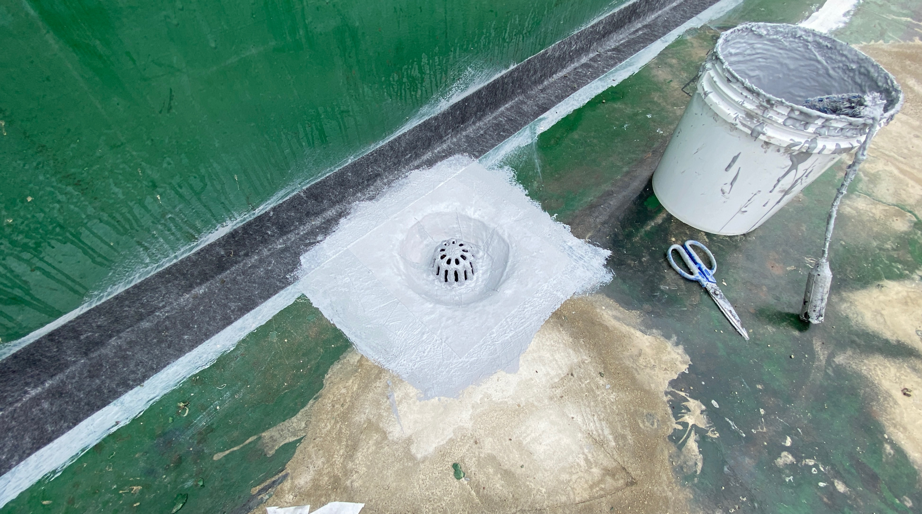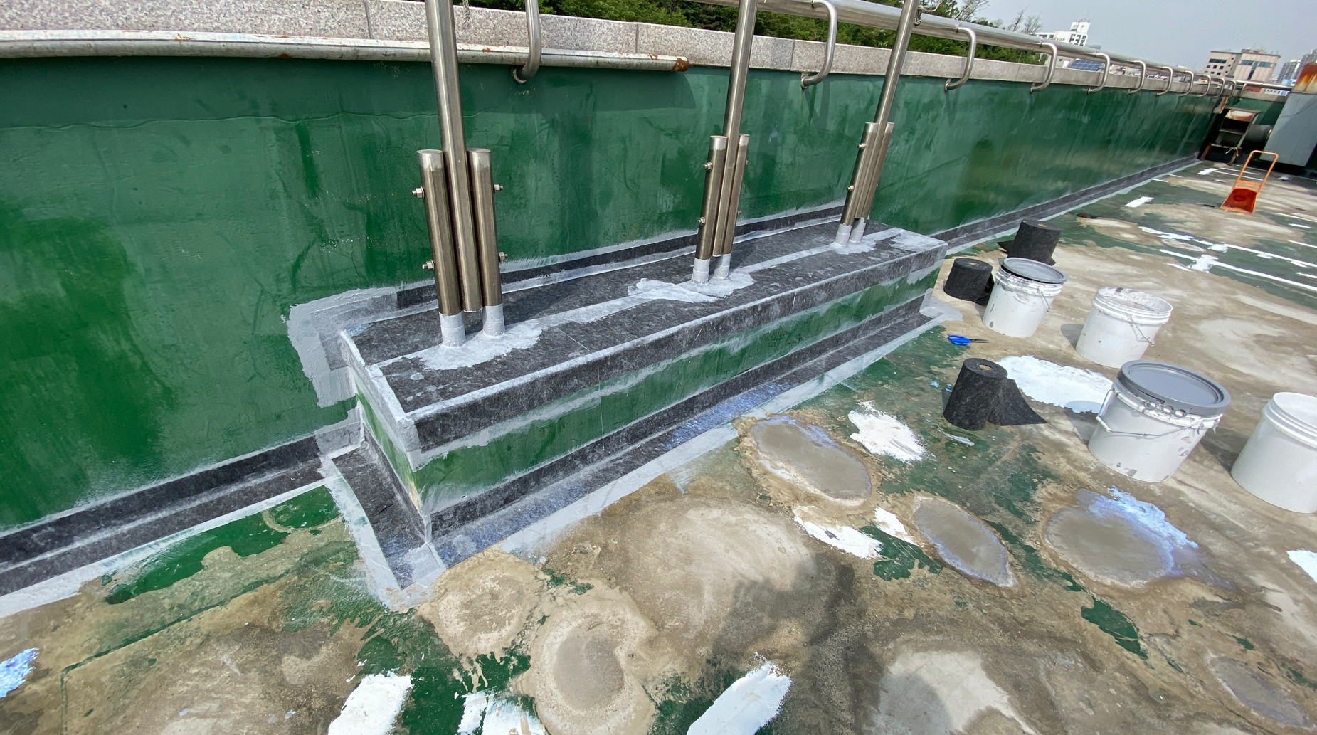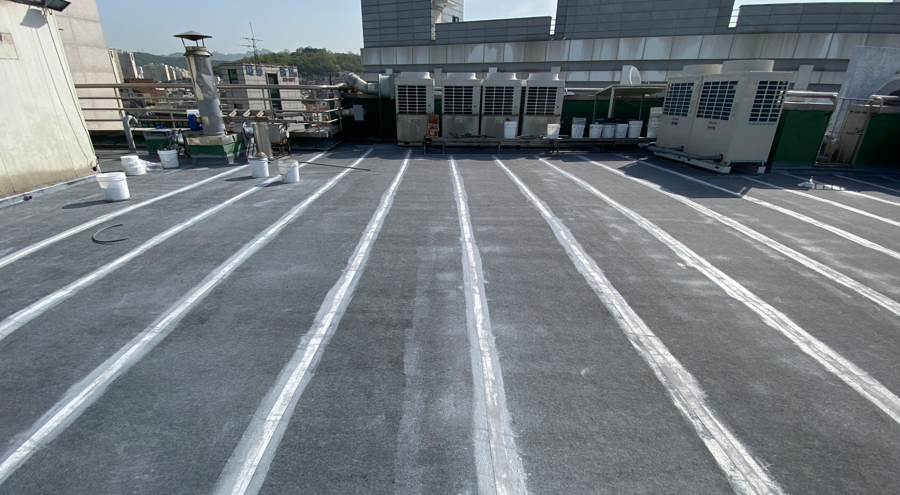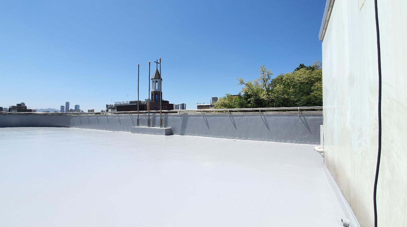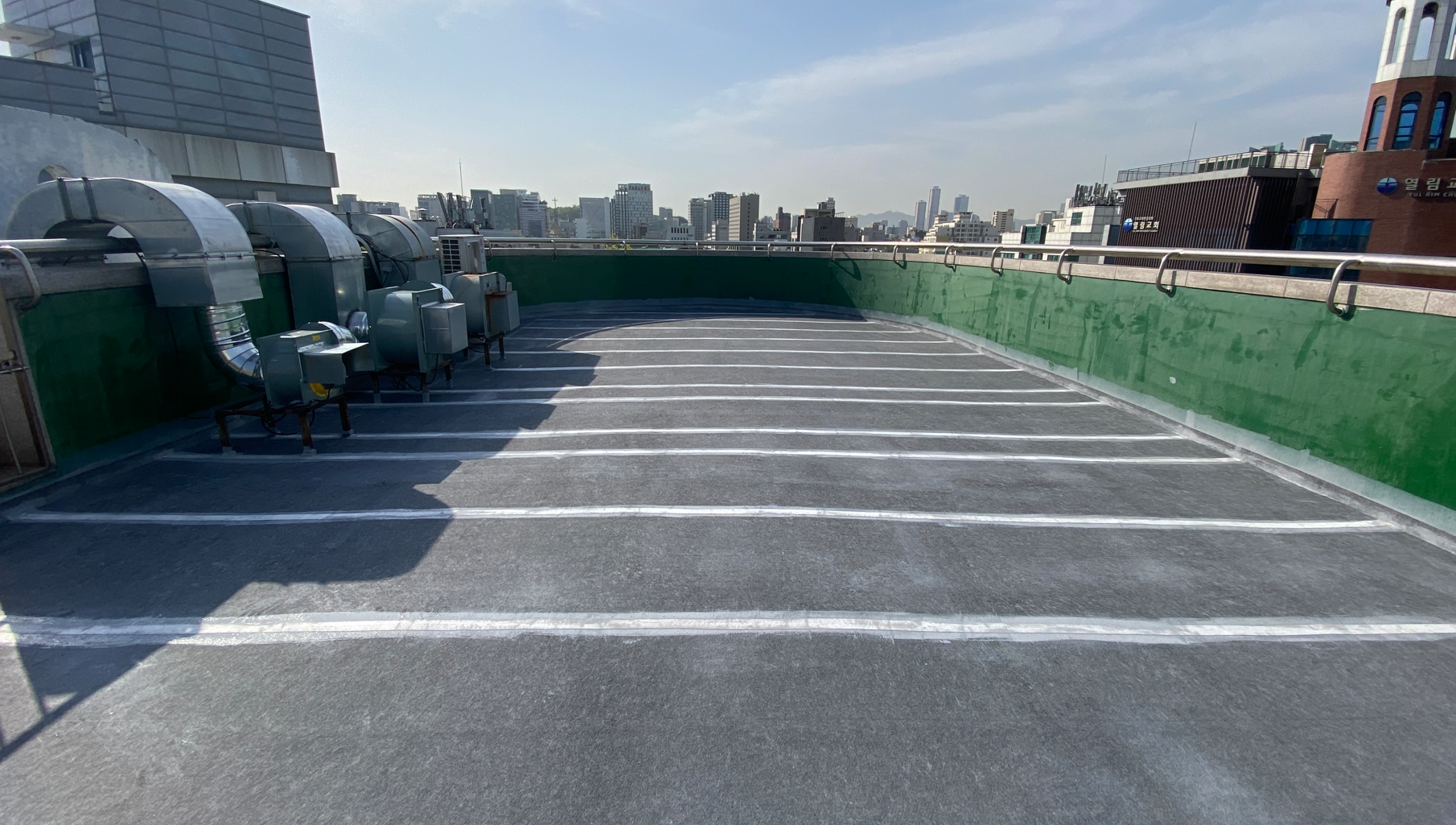 섬세한 작업이 필요한 구조물이 있는 부분이나 누수에 취약한 우수관과 조인트 부분에는 기초 시트 작업을 진행하여 보강합니다. 기초 시트 작업은 방수액을 칠한 후 시트를 알맞게 부착하고 다시 방수액을 칠해 마무리합니다.
