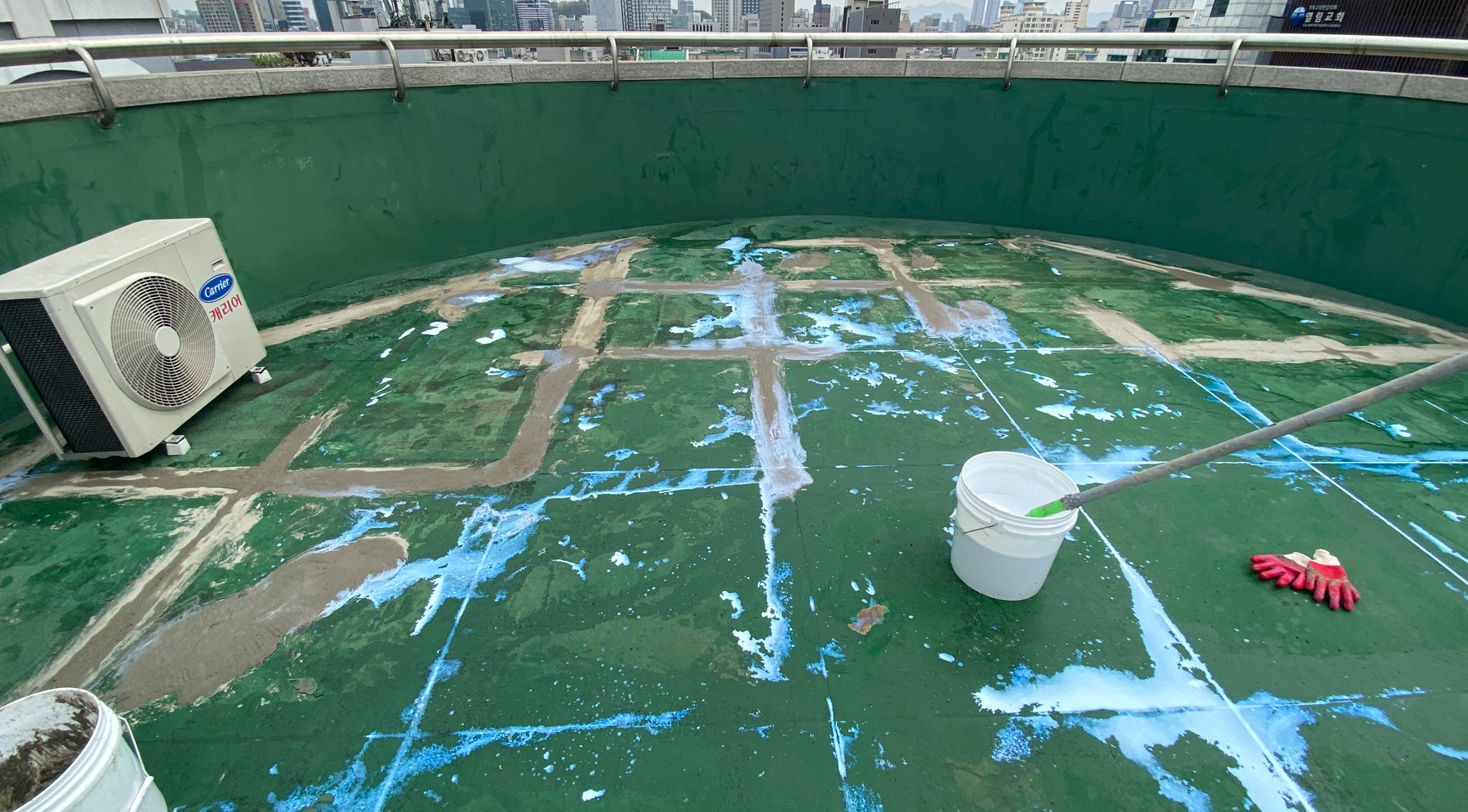 옥상 바닥에는 십자 모양의 홈이 있습니다. 방수시트를 부착하기 위해서는 바닥이 평평한 것이 좋기 때문에 미장 작업을 진행합니다. 미장은 침투 방수액과 몰탈을 일정한 비율로 혼합하여 작업을 진행합니다. 바닥의 홈과 함께 단차도 없애줍니다.