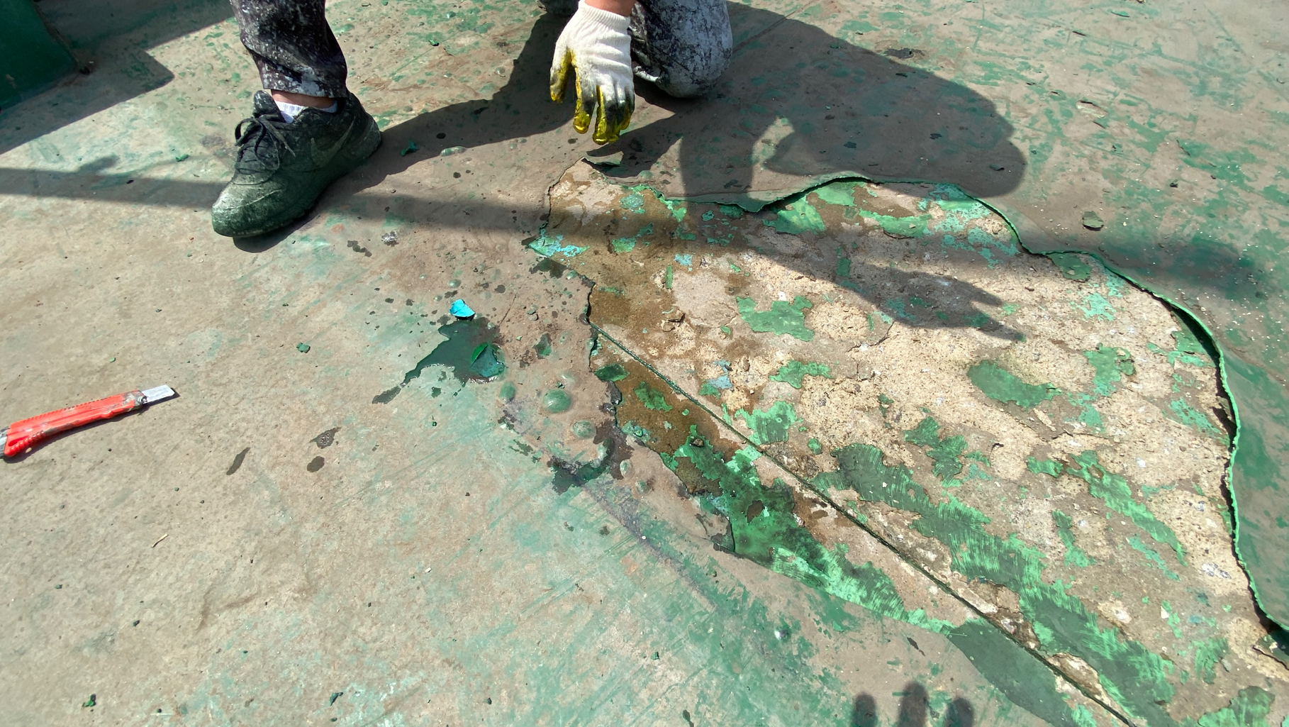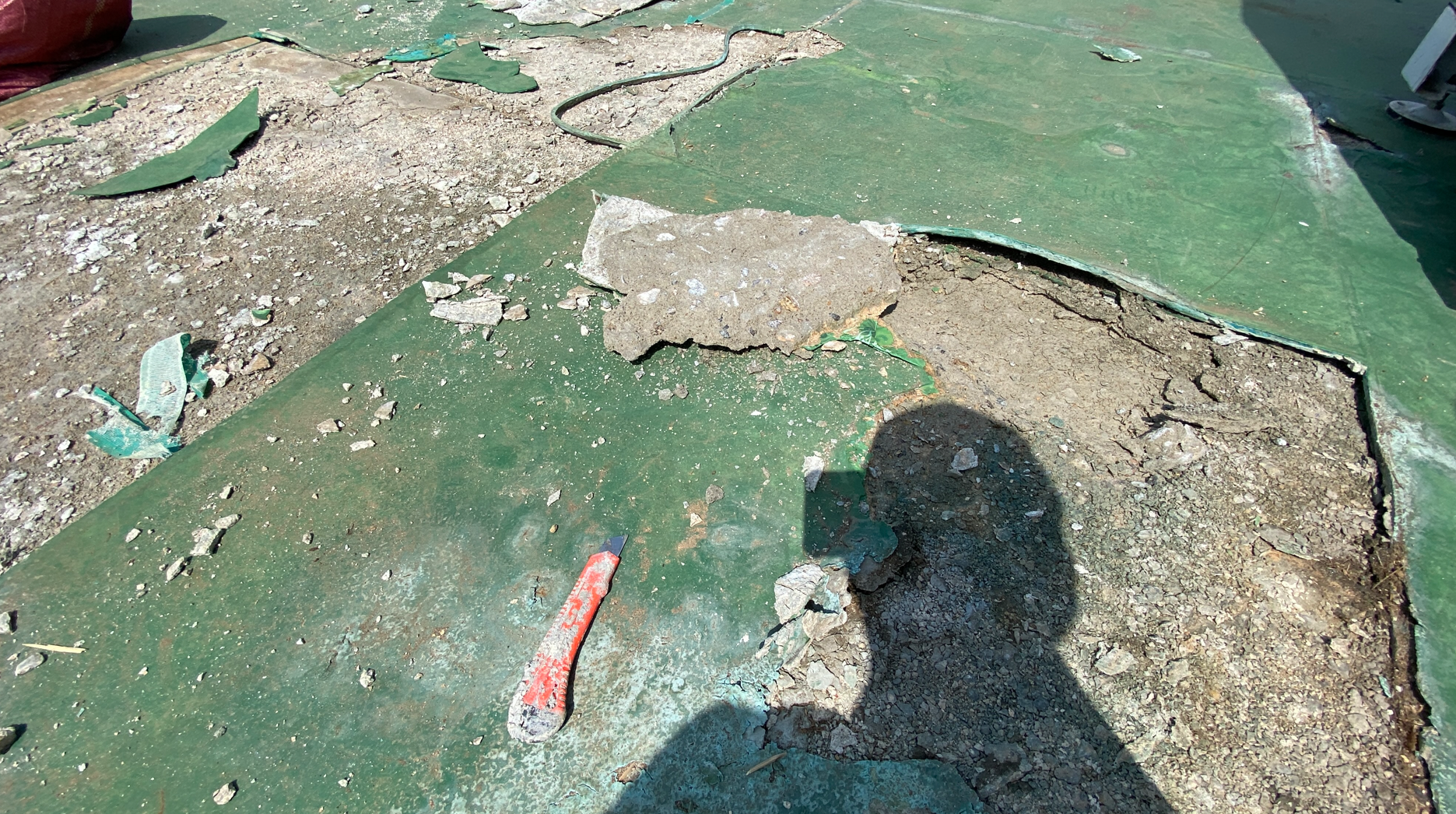 우선 옥상 바닥을 정리해야 합니다. 하자가 심해 더 이상 사용할 수 없는 부분은 칼과 그라인더 등으로 깔끔하게 제거하고, 멀쩡한 부분만을 남기는 작업입니다. 하자가 있는 부분을 그대로 두고 시공을 한다면 그곳을 통해 누수가 재발할 가능성이 높습니다.