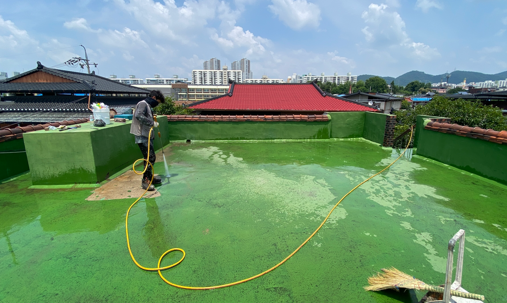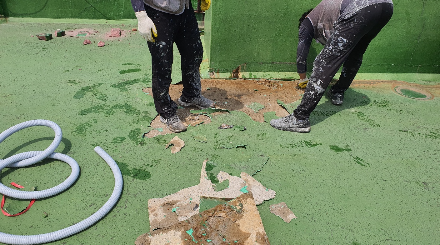 우선 시공에 들어가기 전에 밑작업을 진행합니다. 밑작업은 바탕정리와 물청소 작업인데요. 하자가 심해 계속해서 쓸 수 없는 부분을 제거한 후 물청소 작업으로 옥상을 깨끗하게 만드는 작업입니다. 물청소는 고압 세척기를 사용하여 작업을 진행합니다.