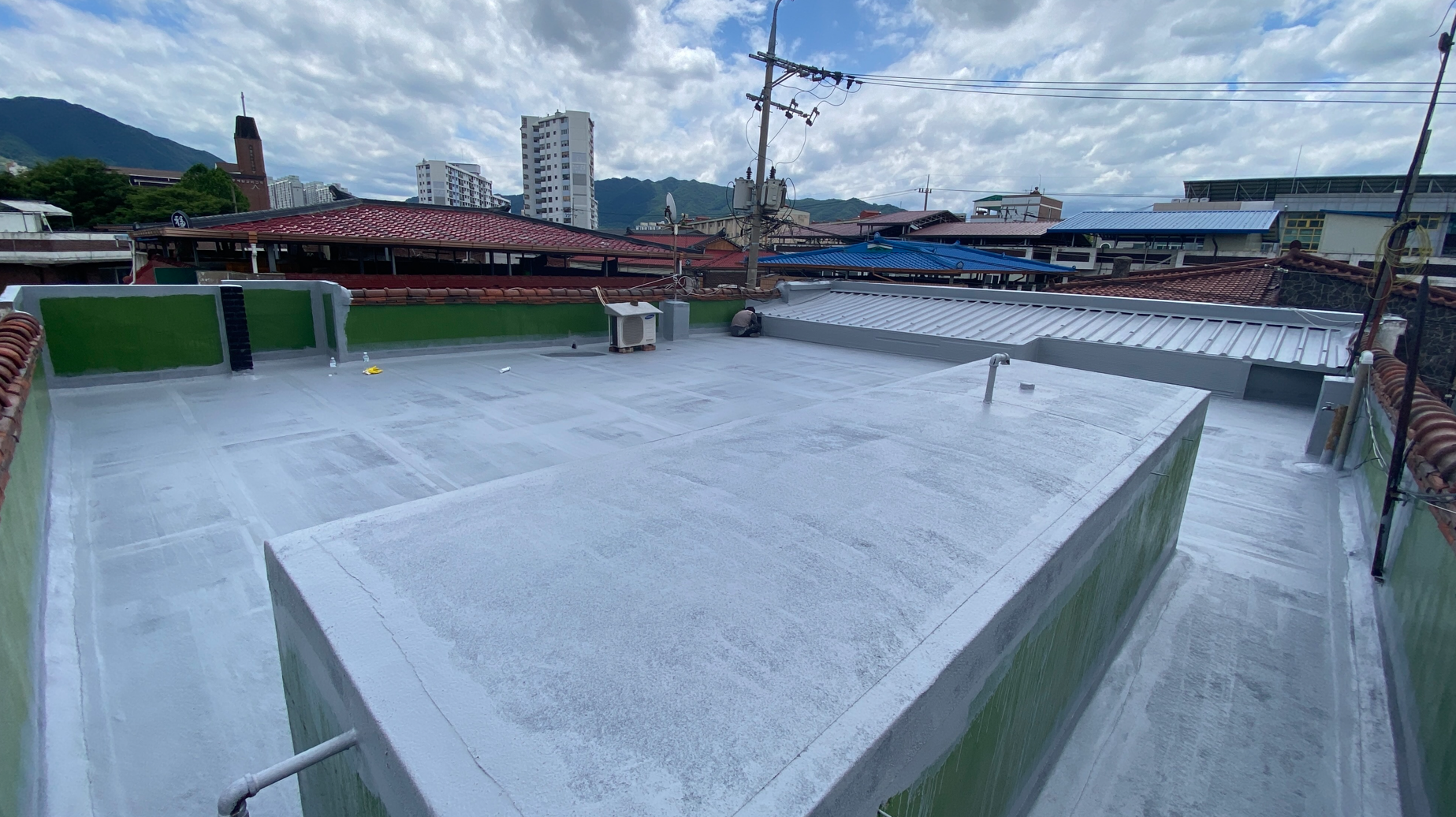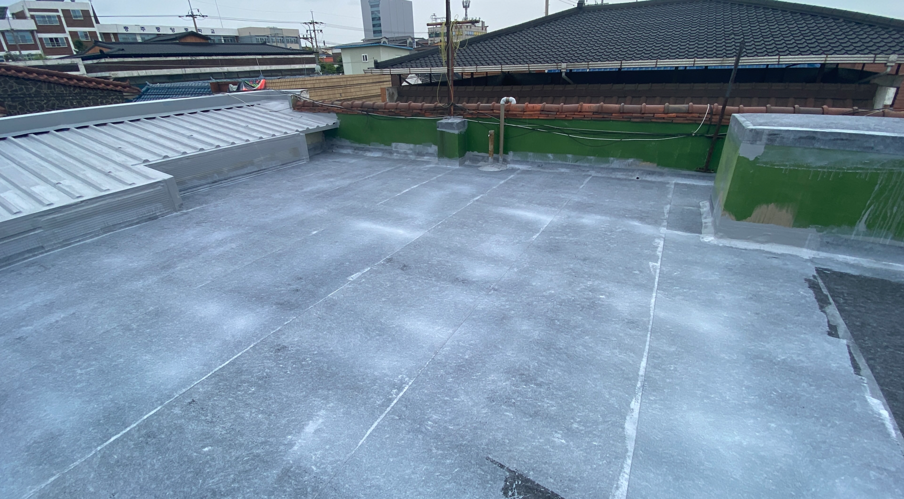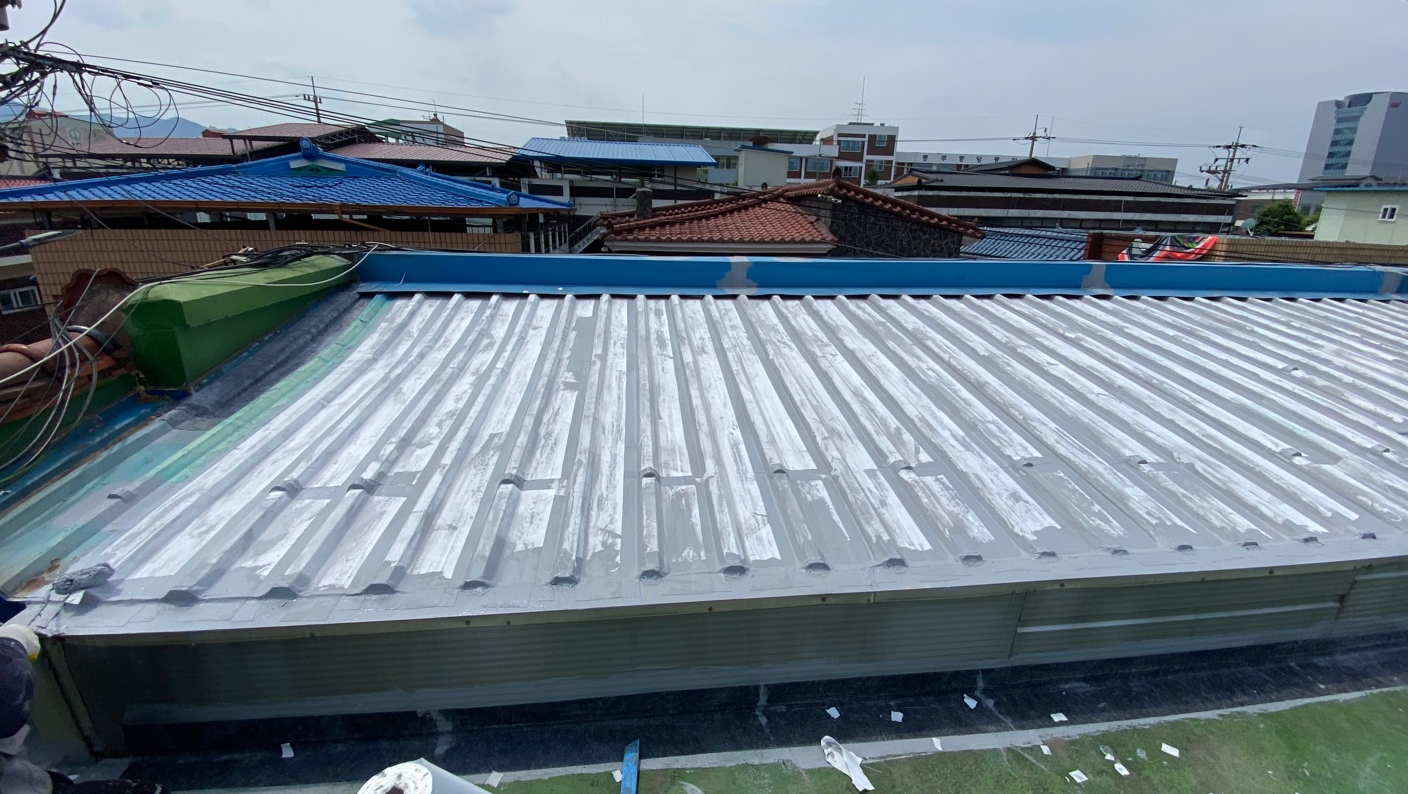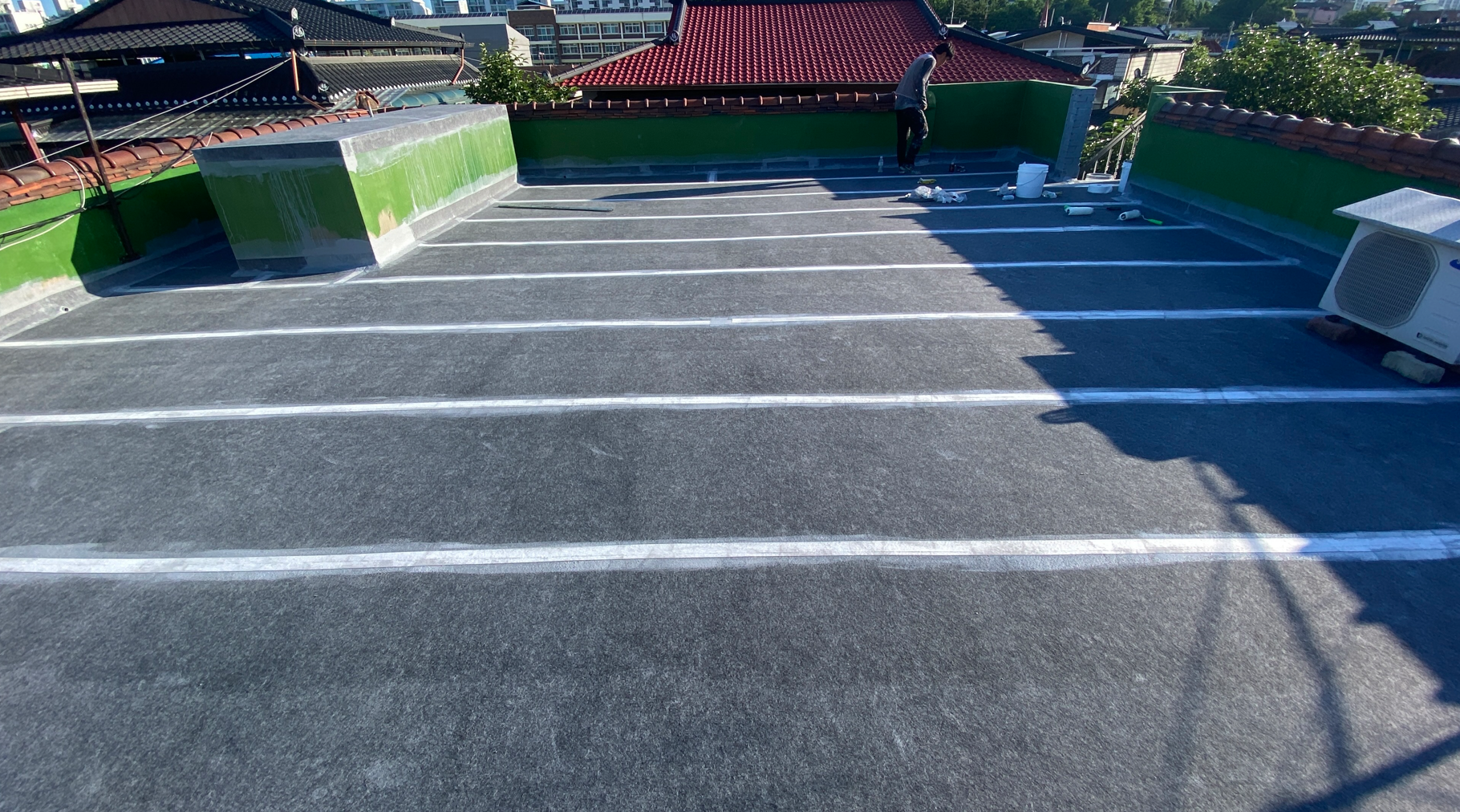 작업 현장에 지붕이 있습니다. 지붕에도 물이 새지 않도록 방수시트를 부착합니다. 마찬가지로 방수액을 칠한 후 지붕 전체에 방수시트를 덮어줍니다. 빈 공간이 없도록 꼼꼼하게 작업을 진행합니다.