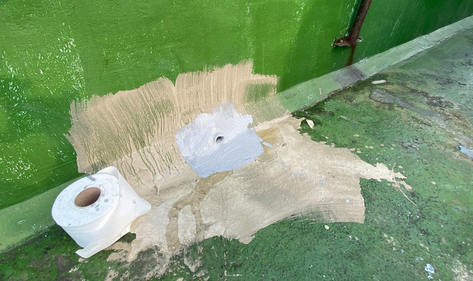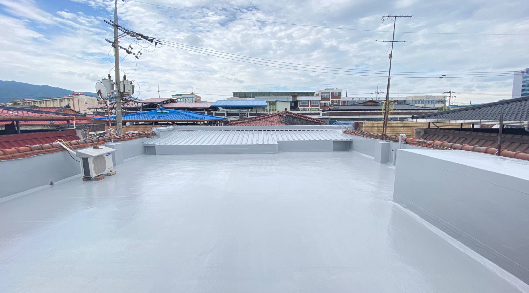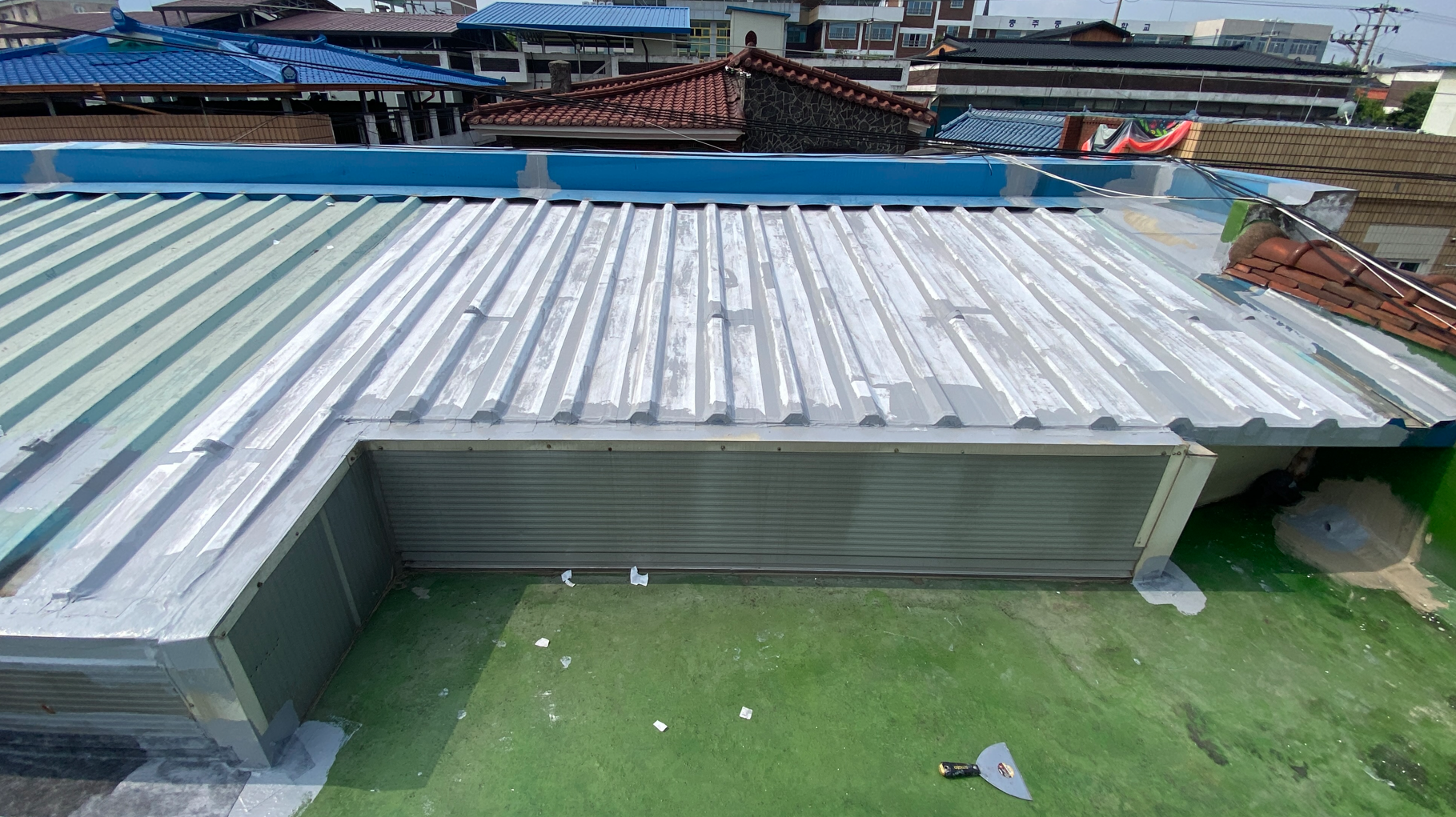 작업 현장에 지붕이 있습니다. 지붕에도 물이 새지 않도록 방수시트를 부착합니다. 마찬가지로 방수액을 칠한 후 지붕 전체에 방수시트를 덮어줍니다. 빈 공간이 없도록 꼼꼼하게 작업을 진행합니다.