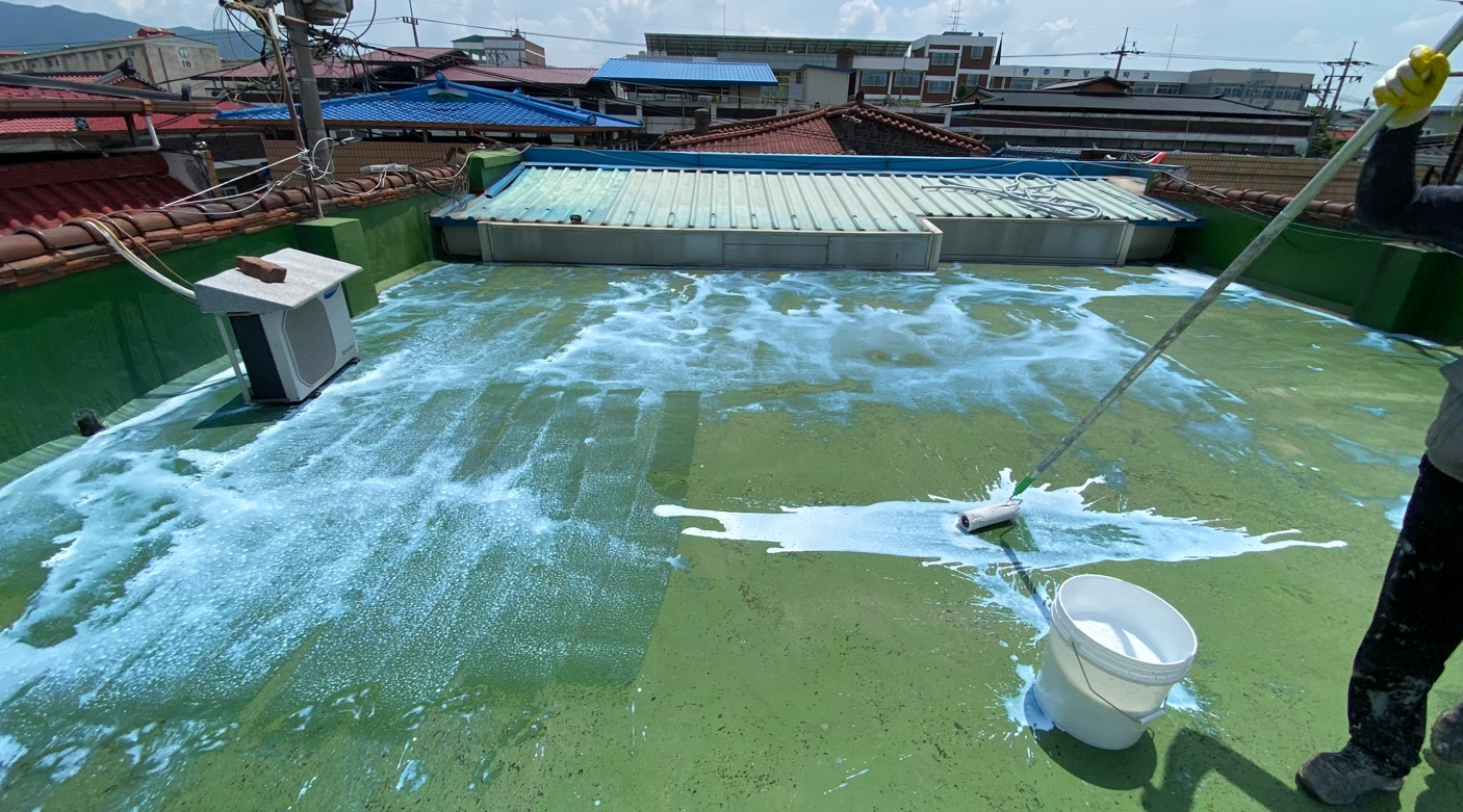 이 옥상에 시공할 것은 복합시트방수입니다. 복합시트방수는 크랙을 잡기 위해 방수시트를 부착하고 그 위에 방수액을 도포하여 방수층을 만드는 작업입니다. 첫 번째 과정으로 프라이머 작업을 진행합니다. 프라이머 작업은 침투 방수액을 옥상 전체에 도포하여 기초적인 방수 효과를 주는 작업입니다.