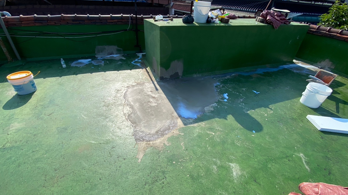 옥상에 단차가 있다면 시트를 부착했을 때 들떠 빈 공간이 생기게 됩니다. 이 틈으로 물이 들어가면 하자가 재발할 수 있기 때문에 단차를 없애주는 작업이 필요한데요. 이를 위해 미장 작업을 진행합니다. 미장은 침투 방수액과 몰탈을 적절하게 혼합하여 작업을 진행합니다.