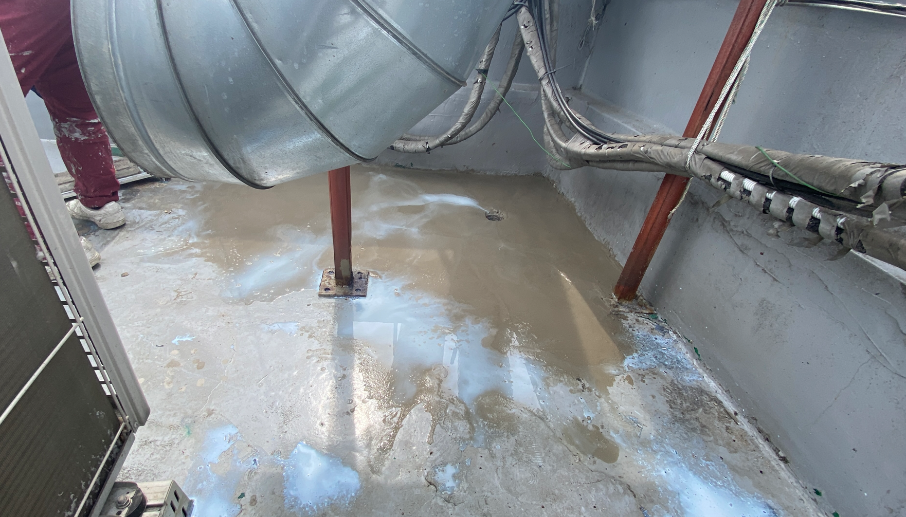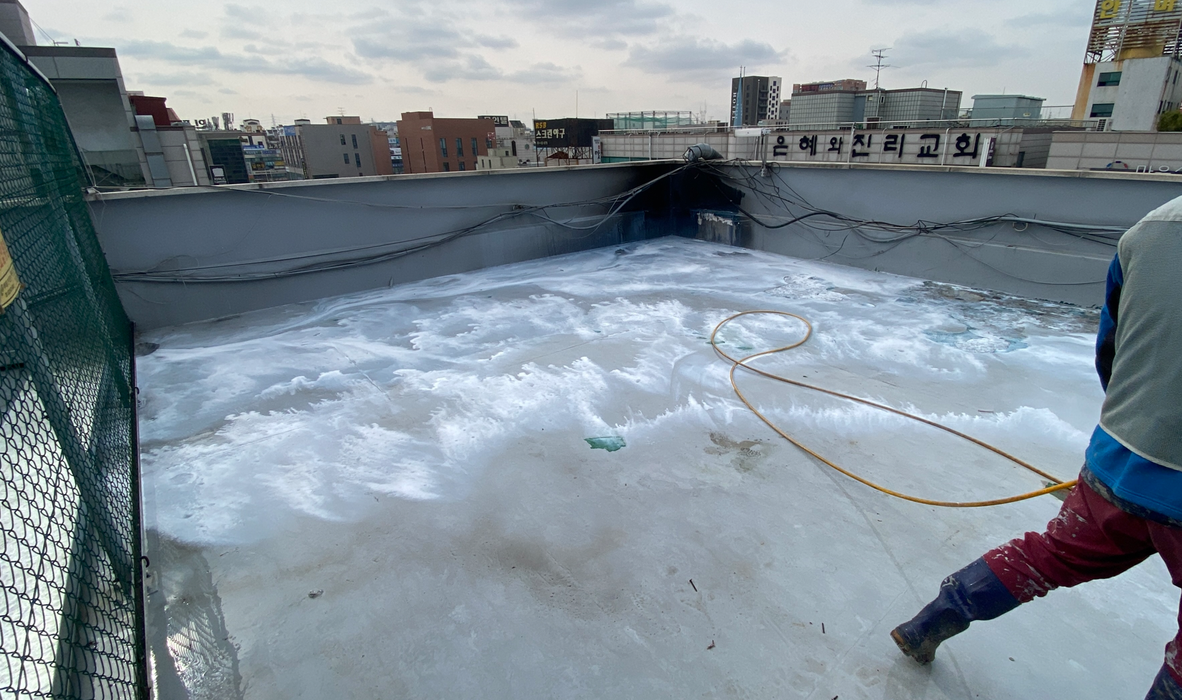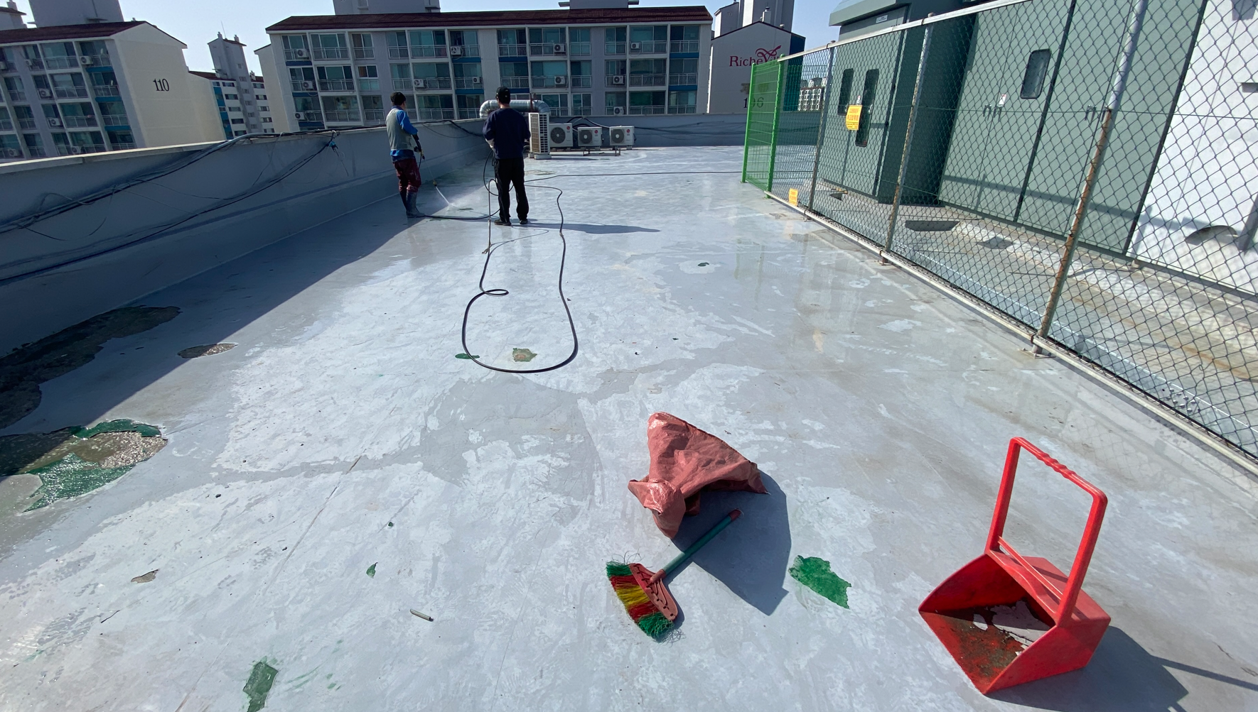 침투 방수제를 도포하기 전에 옥상을 깨끗하게 만들어줍니다. 하자가 심한 부분은 제거하고 계속해서 쓸 수 있는 부분만을 남겨둡니다. 다음으로 옥상에 쌓인 먼지와 이물질을 제거하기 위해 고압 세척기로 물청소를 진행합니다.