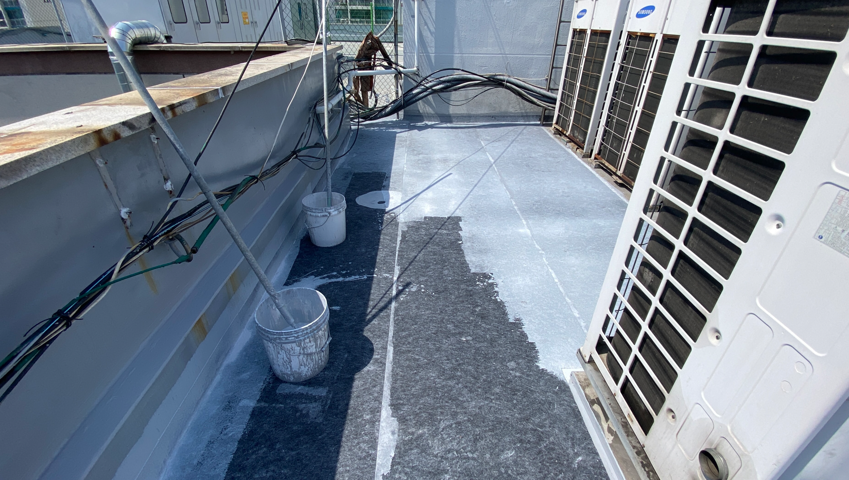 옥상의 크랙을 잡기 위해 방수시트를 바닥 전체에 부착한 후 함침 작업에 들어갑니다. 함침 작업은 침투 방수제를 방수시트 전체에 도포하는 작업입니다. 침투 방수제는 방수시트에 스며들어 옥상 바닥과 서로 일체화시켜 주는 역할을 합니다.