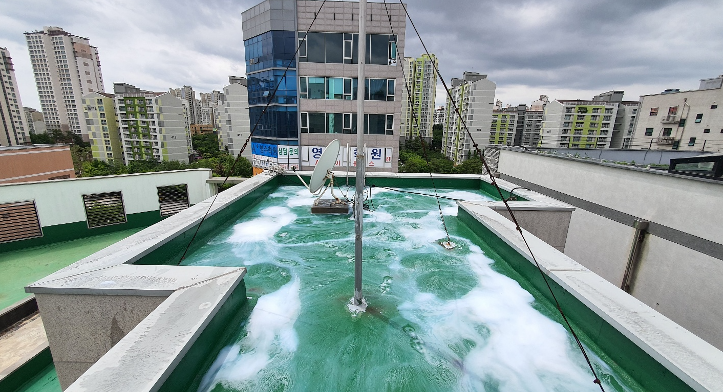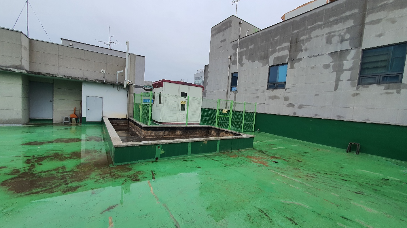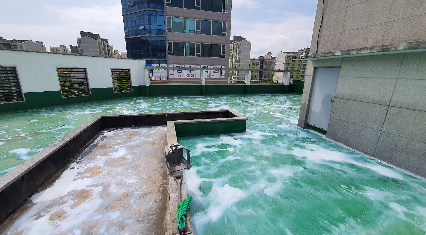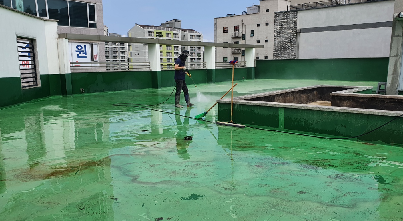 먼저 바닥을 깔끔하게 정리한 후 물청소를 진행합니다. 시공에 들어가기에 앞서 옥상의 먼지와 이물질을 제거하기 위한 작업입니다. 이렇게 밑작업을 해주면 보다 원활한 시공이 가능합니다.