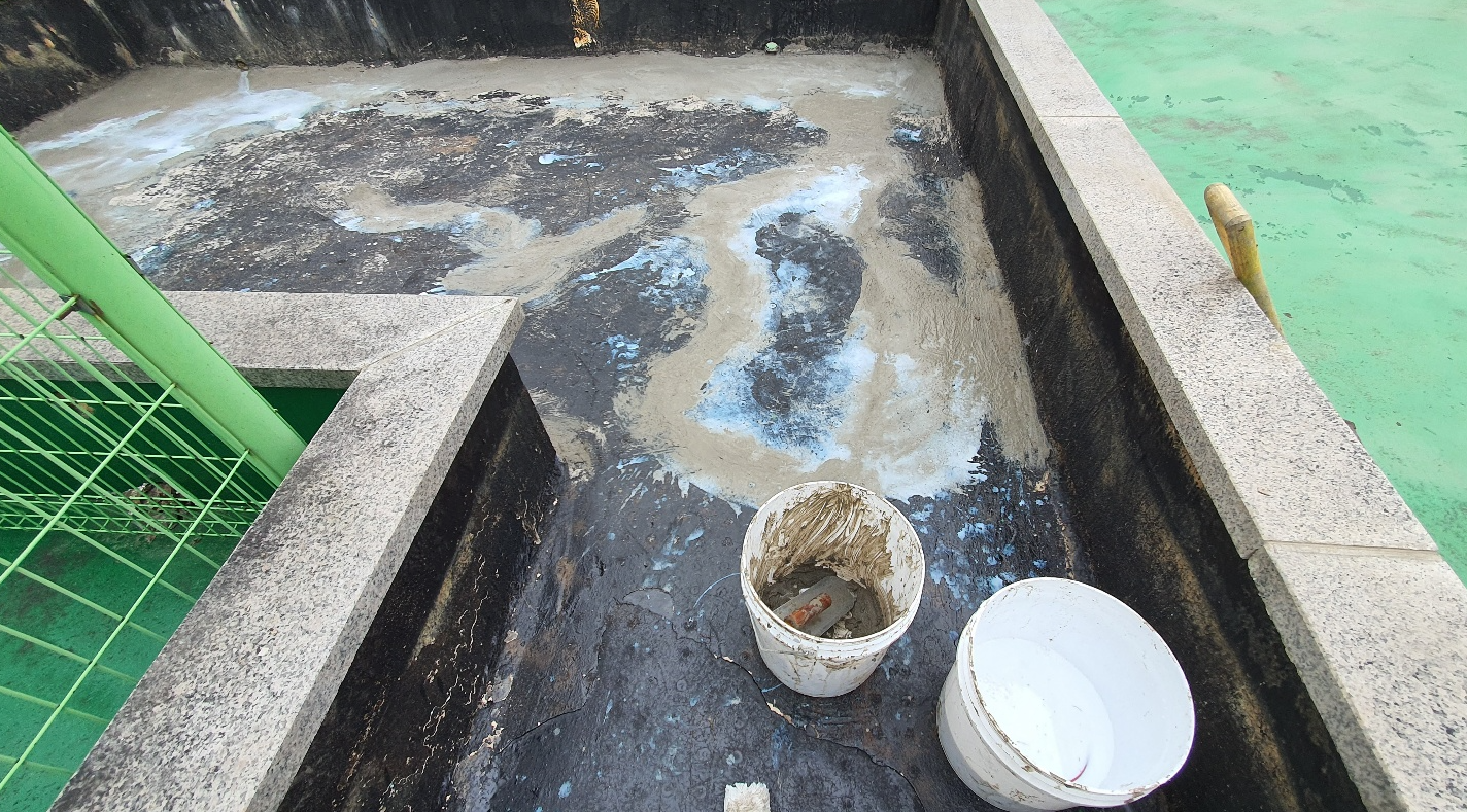 옥상의 크랙을 잡기 위해서는 바닥에 방수시트를 부착하는 것이 좋습니다. 시트를 부착하기 전에 바닥의 단차를 없애는 작업이 필요합니다. 바닥의 단차를 없애기 위해서 침투 방수액과 몰탈을 섞어 미장 작업을 진행합니다.