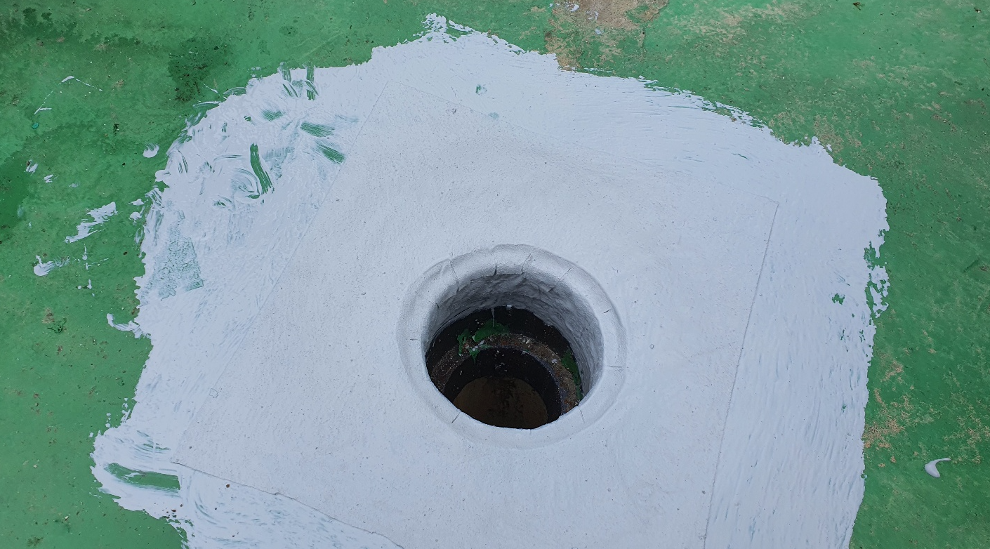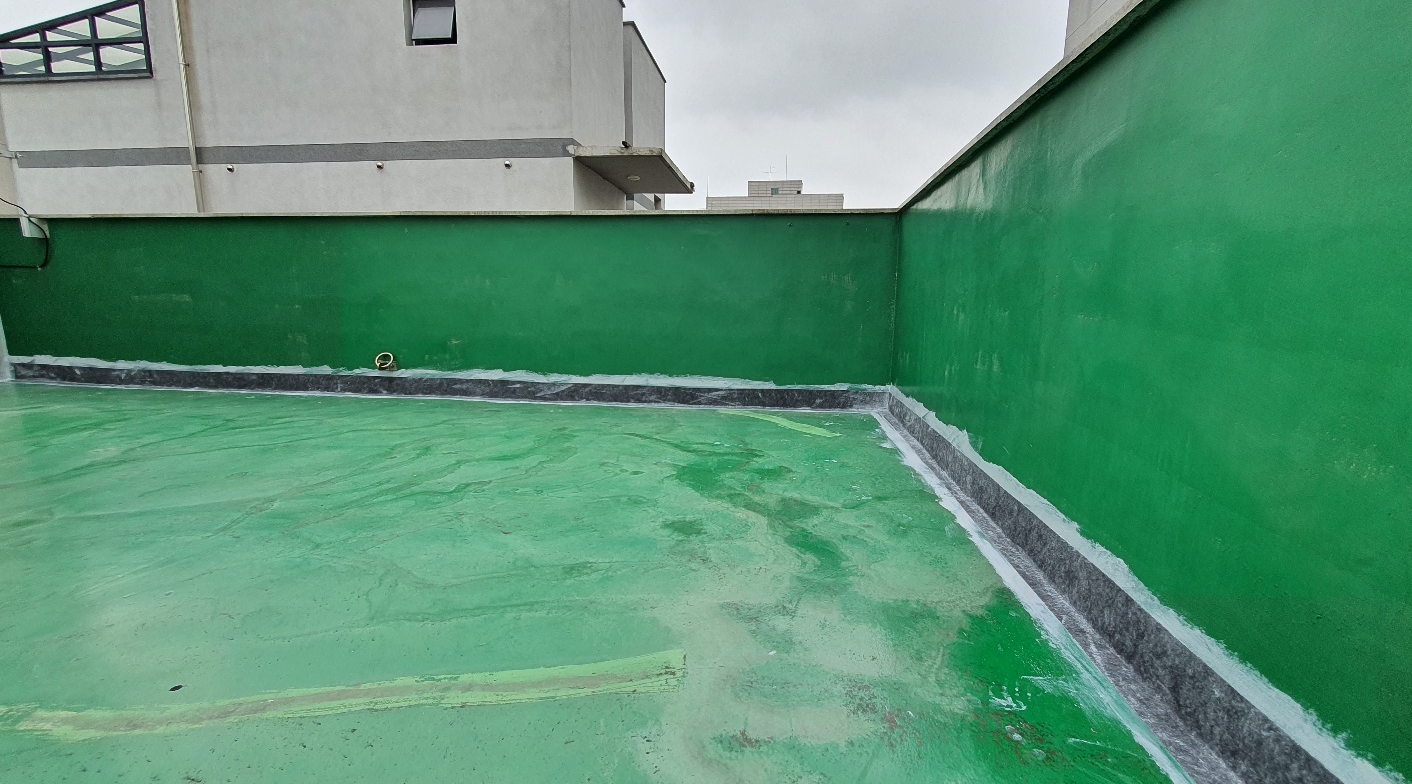 방수시트 작업을 모두 마친 후에는 방수액을 칠합니다. 작업에 사용하는 방수액은 돌가루를 원료로 만든 친환경 무기질 방수액입니다. 방수액은 총 3차례 도포하여 방수층을 만들어줍니다.