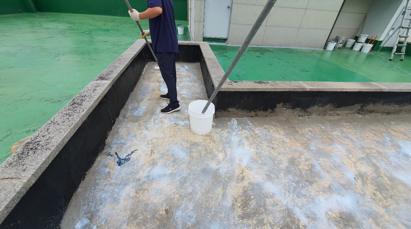 다음은 프라이머 작업입니다. 프라이머 작업은 침투 방수액을 옥상 바닥에 전체적으로 도포하는 작업입니다. 침투 방수액은 옥상의 미세한 먼지와 이물질을 흡착하여 제거하고 바닥에 스며들어 방수 효과를 주는 역할을 합니다.