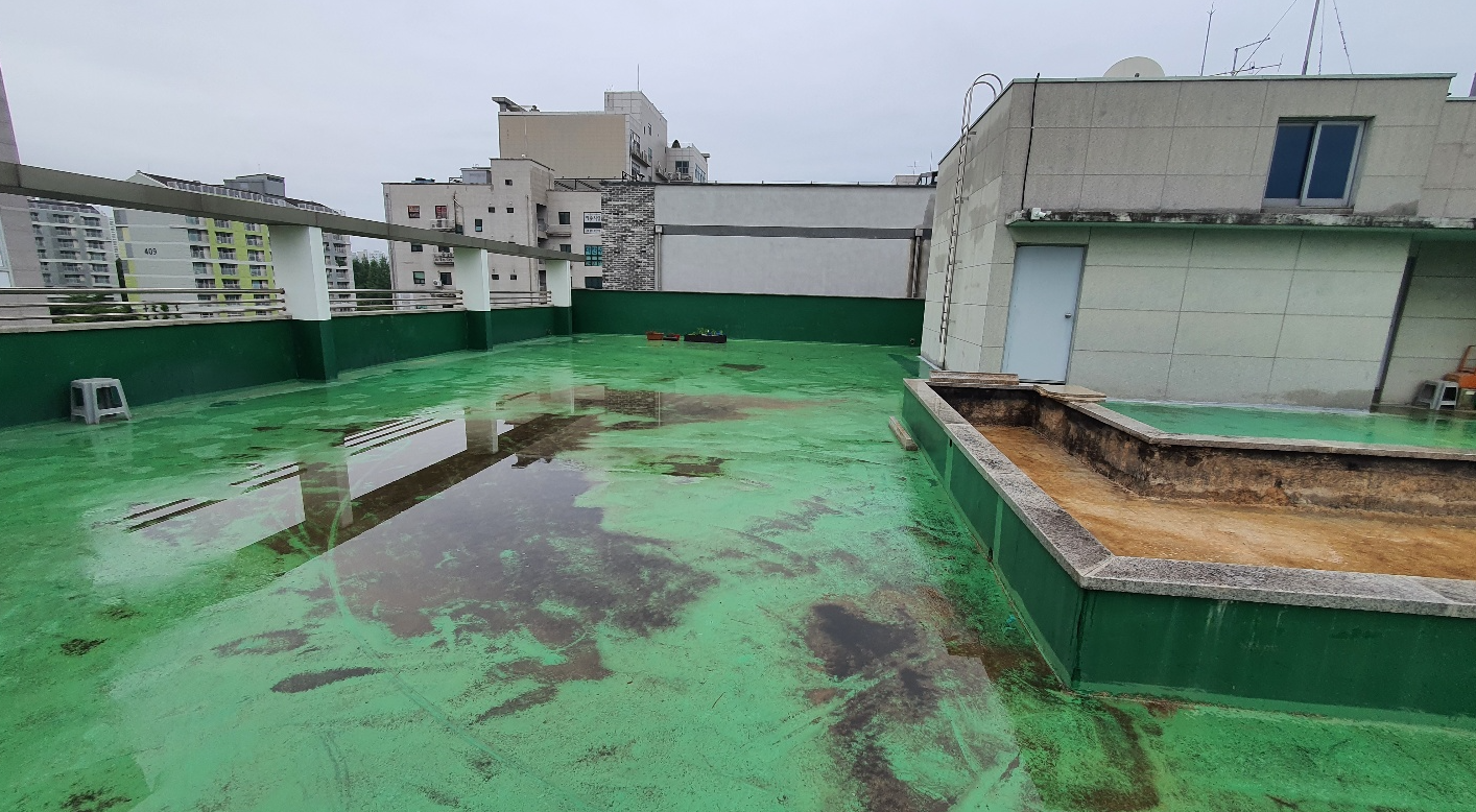 하자가 발생한 옥상의 모습입니다. 우레탄으로 시공한 현장으로 시간이 흐름에 따라 생긴 크랙으로 물이 들어가 하자가 발생했습니다. 우레탄은 크랙이 생겼을 때 고정하는 힘이 없기 때문에 하자가 계속해서 재발합니다.