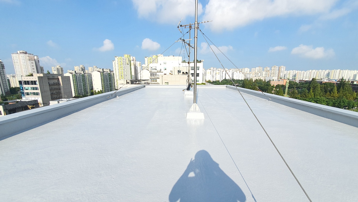 마지막으로 상도 작업을 진행합니다. 방수액을 자외선으로부터 보호하기 위한 과정입니다. 옥상의 크랙을 확실하게 해결하기 위해서는 이렇게 방수시트로 시트방수를 하고 방수액을 칠해 완벽하게 마무리해 주는 것이 좋습니다.