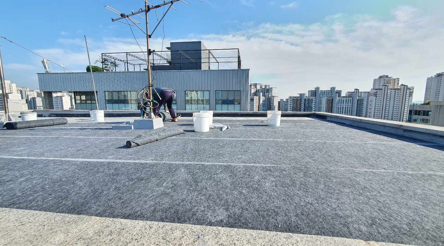 기초 작업을 마무리한 후 옥상 바닥에 방수시트를 부착합니다. 옥상의 크랙을 잡기 위한 시트방수에서 가장 중요한 작업이라고 할 수 있습니다. 질긴 섬유 소재의 시트를 사용해 작업하기 때문에 크랙을 확실하게 고정할 수 있습니다. 방수액을 칠한 후 방수시트를 꼼꼼하게 부착합니다.