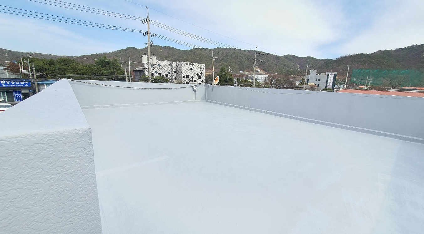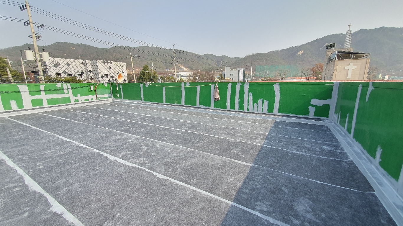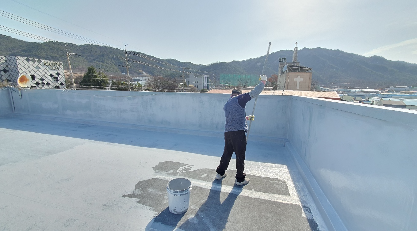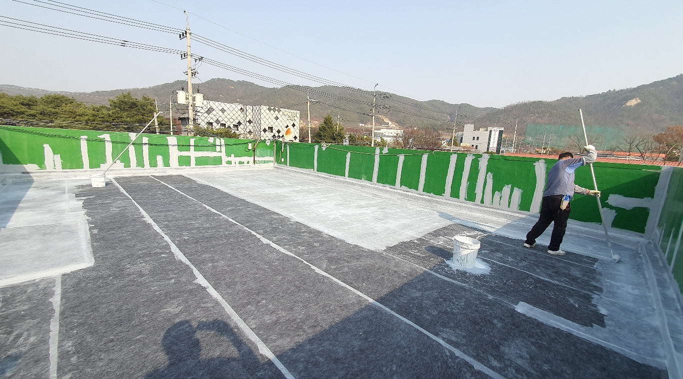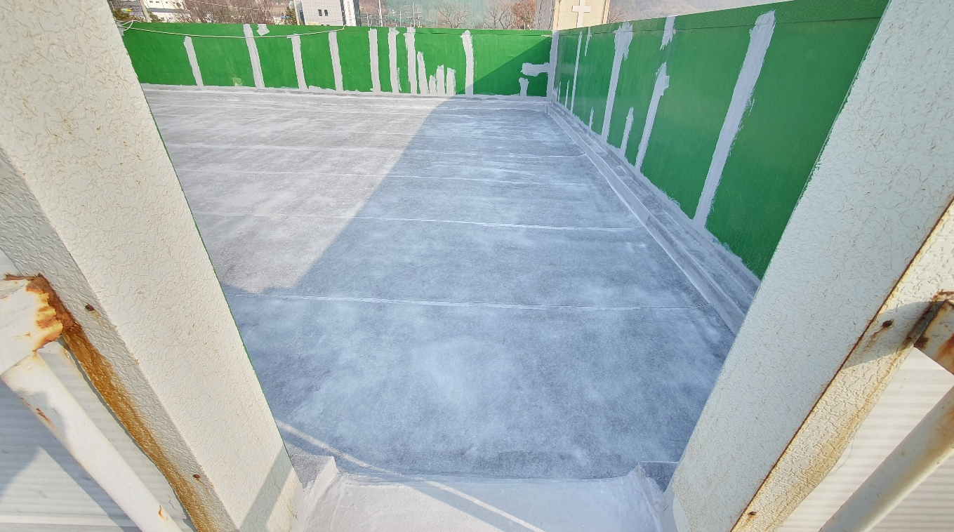 마지막으로 방수액을 보호하기 위한 상도 작업을 진행합니다. 이렇게 방수시트를 부착해 크랙을 확실하게 잡고 방수액을 칠해 방수층을 만들어주면 확실하게 옥상에 방수 시공을 할 수 있습니다. 완성된 옥상은 이후 상처가 나더라도 그 부분만 고쳐서 계속해서 반영구적으로 사용할 수 있습니다.