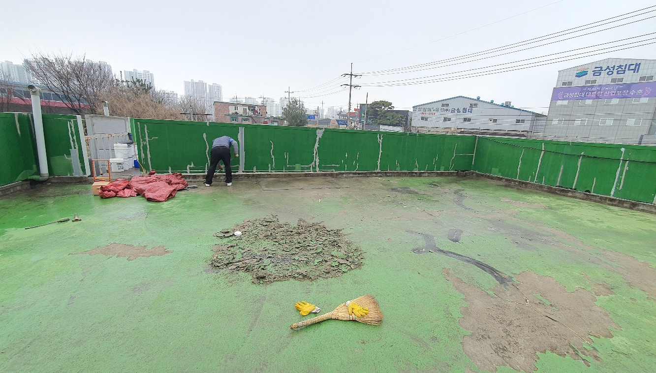 먼저 원활한 시공을 위해 바닥을 정리하고 물청소를 진행합니다. 하자가 너무 심해 더 이상 사용할 수 없는 부분은 들어내 제거하고 장시간 쌓인 먼지와 이물질을 깨끗하게 청소합니다. 물청소에는 고압 세척기를 사용해 작업하기 때문에 깨끗하게 정리가 가능합니다.