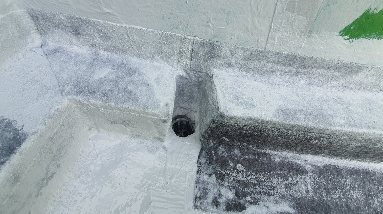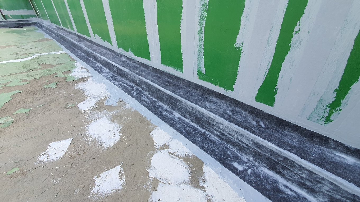 누수가 자주 발생하는 우수관과 벽체와 바닥이 만나는 조인트 부분에는 기초 시트 작업을 진행합니다. 방수액을 칠한 후 방수시트를 부위에 알맞게 부착한 후 다시 방수액을 칠해 마무리합니다. 누수에 취약한 부분을 보강하기 위한 작업입니다.