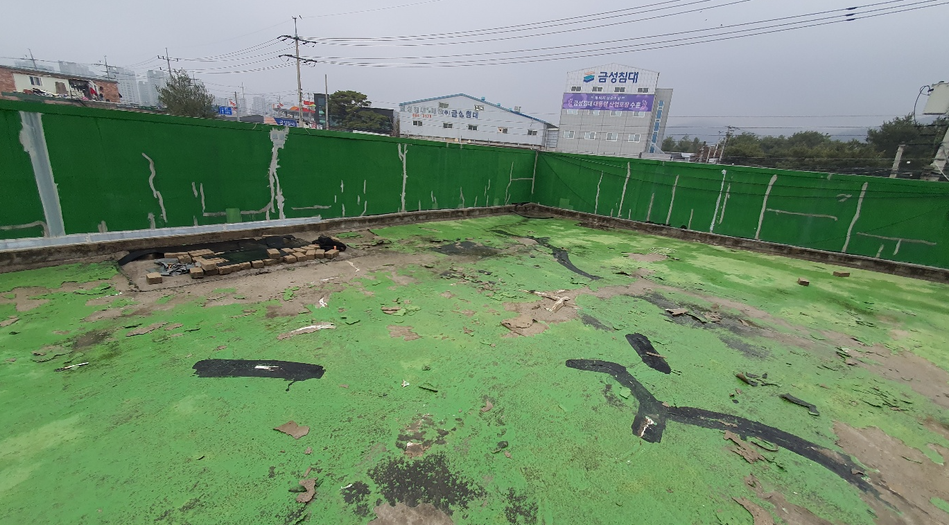 우레탄으로 시공한 옥상의 모습입니다. 시간이 지남에 따라 바닥이 벗겨진 부분도 많고 하자를 보강하기 위해 무언가를 칠한 흔적도 보입니다. 벽체 또한 하자가 심하게 발생한 모습입니다. 우레탄은 크랙을 잡을 수 있는 힘이 없어 한 번 하자가 발생하면 아무리 덧칠을 해도 계속해서 하자가 발생합니다.