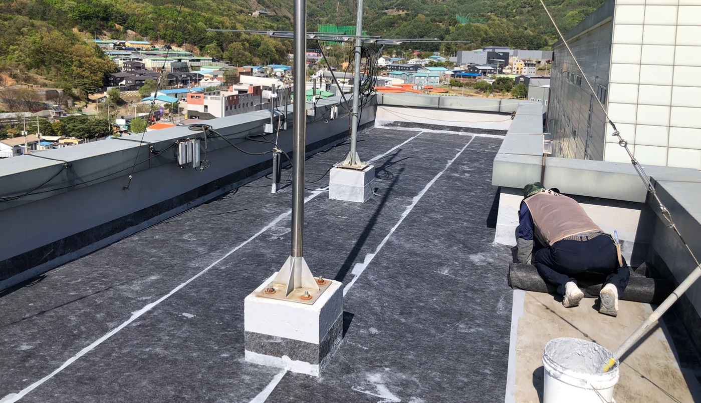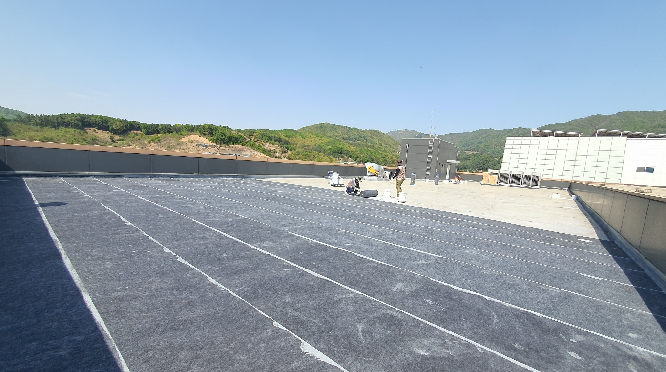 다음으로 옥상 바닥 전체에 방수시트를 부착합니다. 옥상 바닥의 크랙을 전체적으로 덮어 하자가 재발하지 않게 만들기 위한 작업입니다. 방수액을 접착제 역할을 하도록 칠한 후 시트를 빈 틈 없이 부착합니다. 작업에는 섬유 소재의 시트를 사용하여 크랙을 확실하게 잡아줄 수 있습니다.