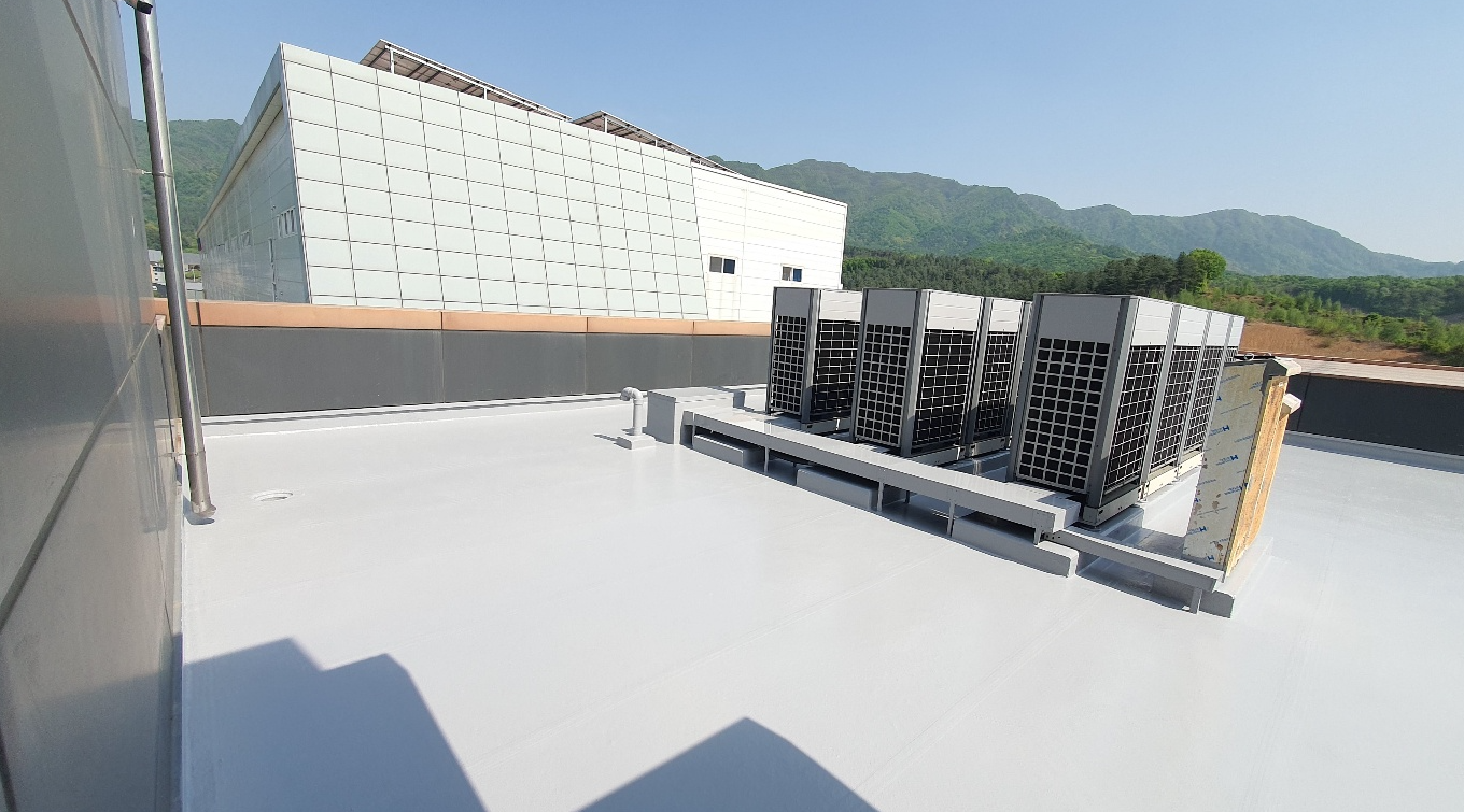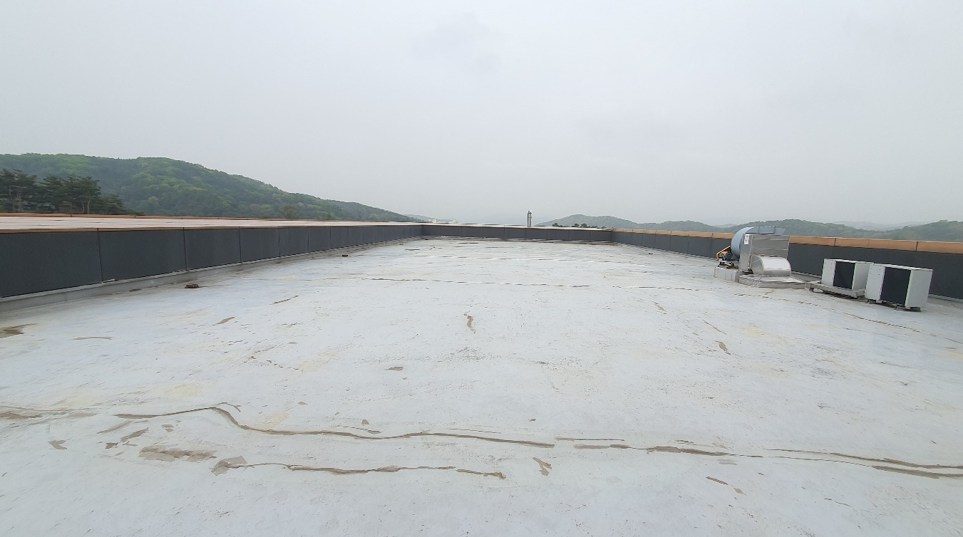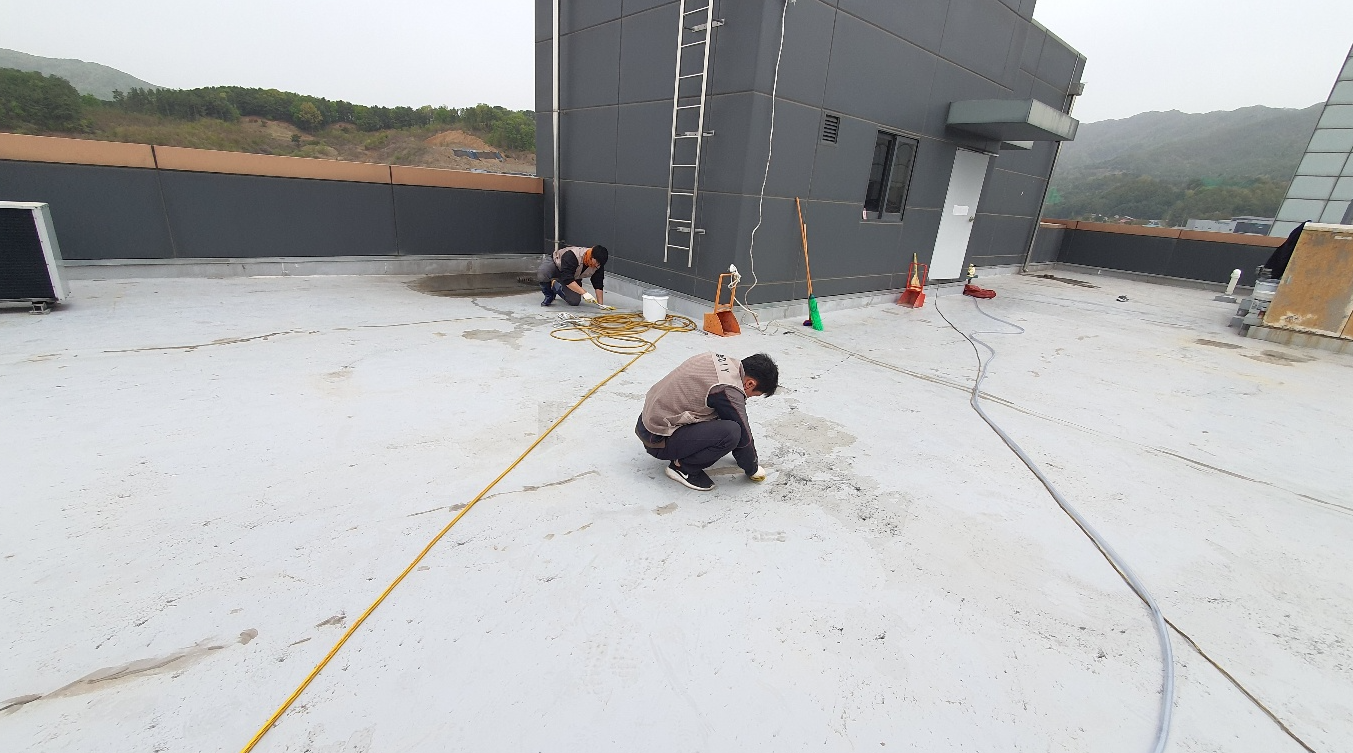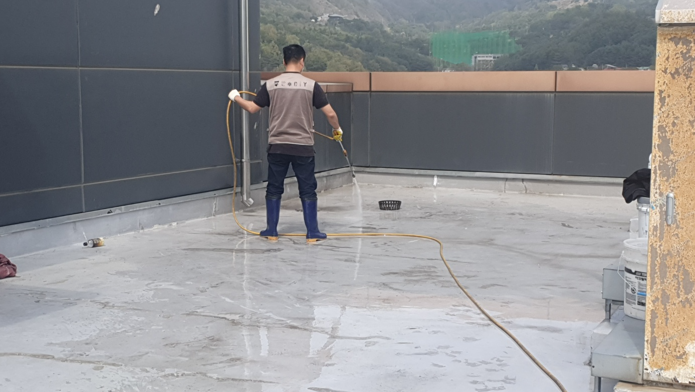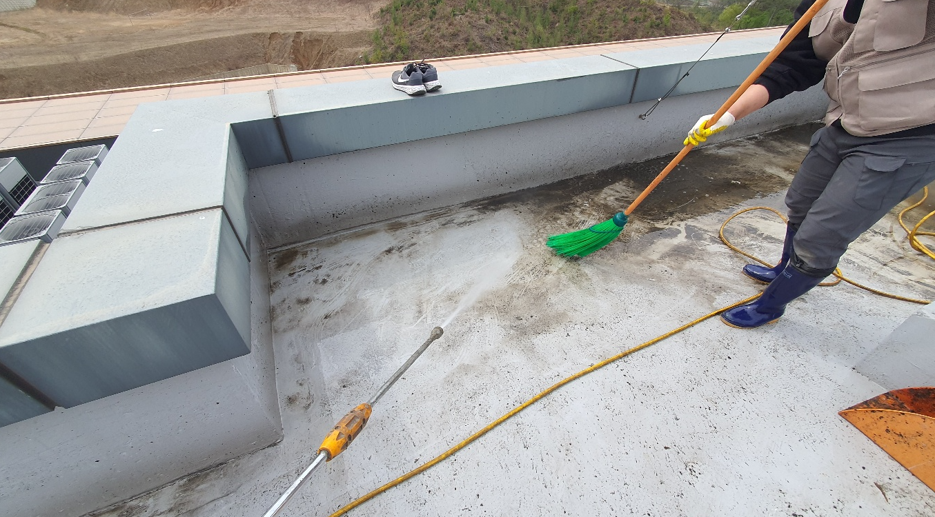 옥상 곳곳에 쌓인 먼지와 이물질을 청소하기 위해서 물청소 작업을 진행합니다. 물청소는 고압 세척기를 사용하여 작업하기 때문에 깨끗하게 청소가 가능합니다.