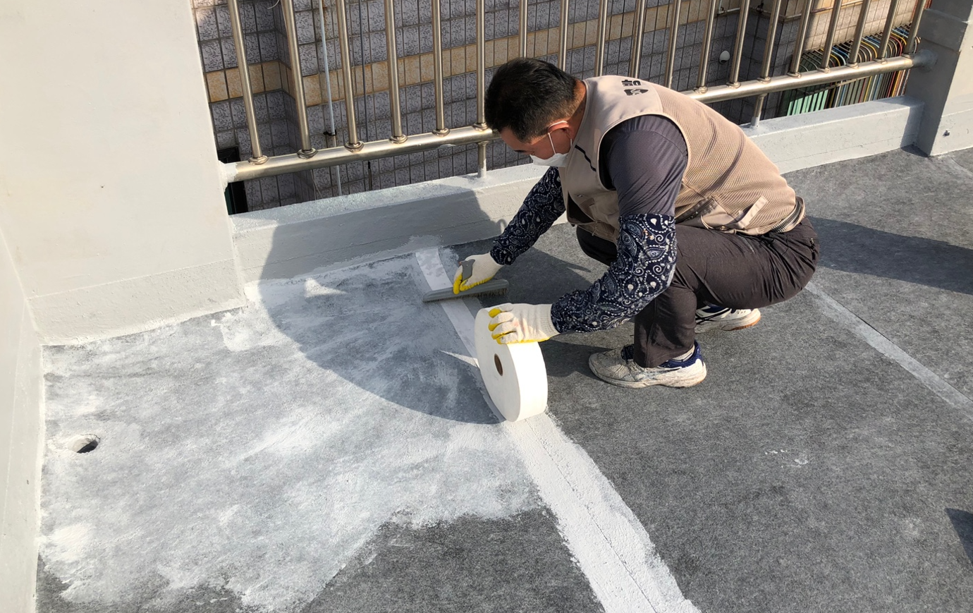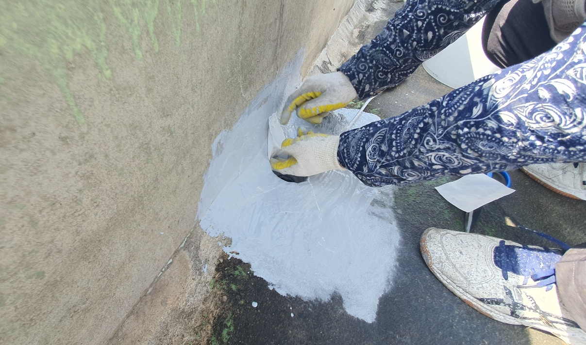 누수가 자주 발생하는 우수관과 벽체 조인트 부분에는 기초 시트 작업을 진행합니다. 누수에 취약한 부분을 방수액과 방수시트로 보강하는 작업입니다. 방수액을 칠한 후 시트를 부위에 알맞은 크기로 잘라 붙인 후 다시 방수액을 칠해 마무리합니다.