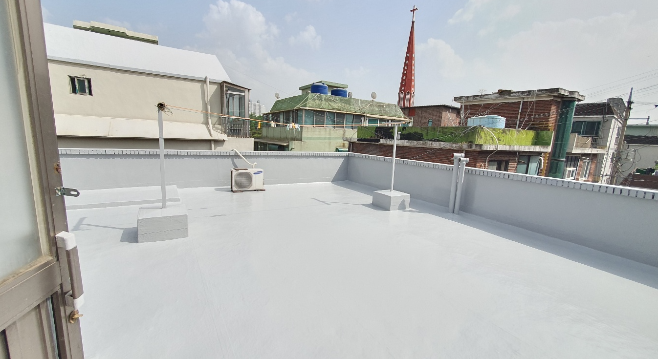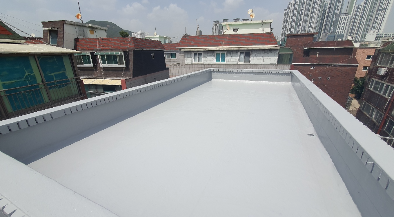 마지막 작업으로 상도를 진행합니다. 상도는 자외선을 차단하여 방수액을 보호하는 역할을 합니다. 우레탄 방수로 잡기 힘든 누수를 해결하기 위해서는 방수시트로 확실하게 크랙을 해결한 뒤 방수액을 칠하는 것이 좋습니다. 완성된 옥상은 반영구적으로 사용할 수 있어 우레탄 방수보다 훨씬 오랫동안 이용할 수 있습니다.