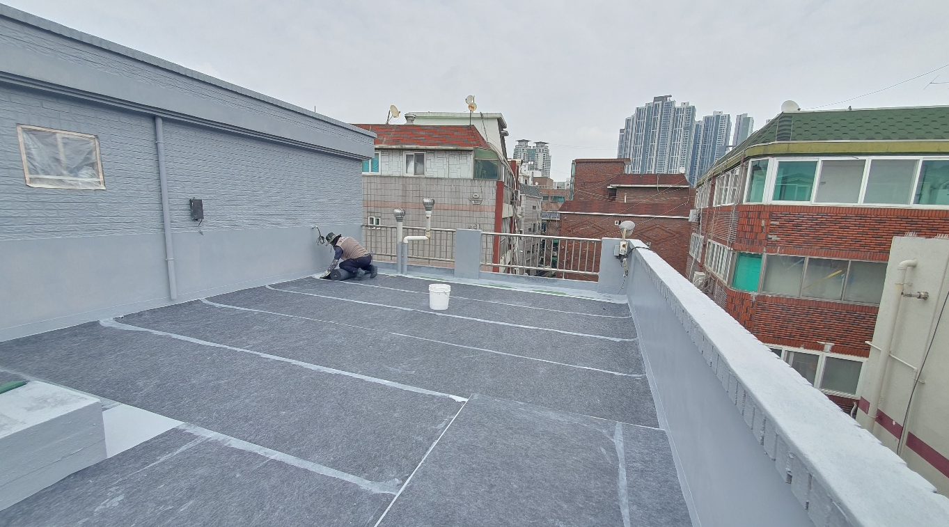 다음으로 바닥 전체에 방수시트를 부착합니다. 접착제 역할을 할 수 있도록 방수액을 먼저 칠한 후 방수시트를 꼼꼼하게 부착합니다. 이때 가장자리를 조금씩 겹쳐서 부착하는 것이 좋습니다. 작업에 사용한 방수시트는 옥상의 크랙을 잡아줄 수 있는 질긴 섬유 소재의 시트입니다.