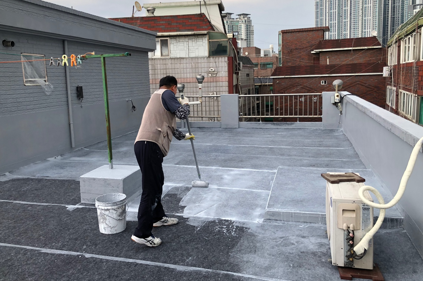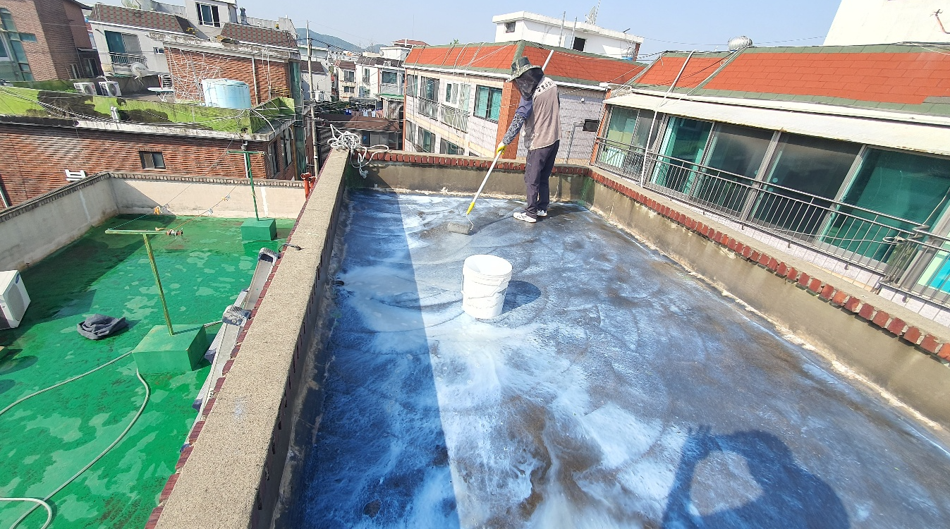 방수시트 작업을 모두 마쳤으니 이제 방수액을 도포할 차례입니다. 방수액은 총 3차례 도포하게 됩니다. 작업에 사용하는 방수액은 돌가루를 원료로 만든 친환경 무기질 방수액으로 인체에 무해하고 자극적인 냄새가 없어 시공 후 쾌적합니다.
