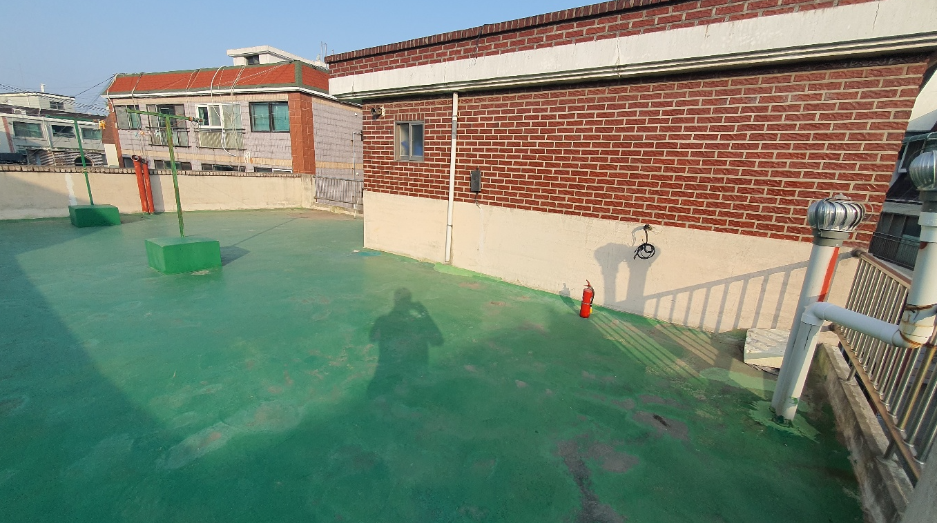 우레탄으로 시공한 옥상입니다. 하자가 발생한 부분에 우레탄을 덧칠해 보수한 부분이 보입니다. 하지만 크랙을 근본적으로 해결하진 못하기 때문에 얼마 못 가 다시 하자가 재발하게 될 것입니다. 누수의 원인이 되는 옥상의 크랙을 해결하기 위해 방수시트를 부착한 후 방수액을 도포할 계획입니다.