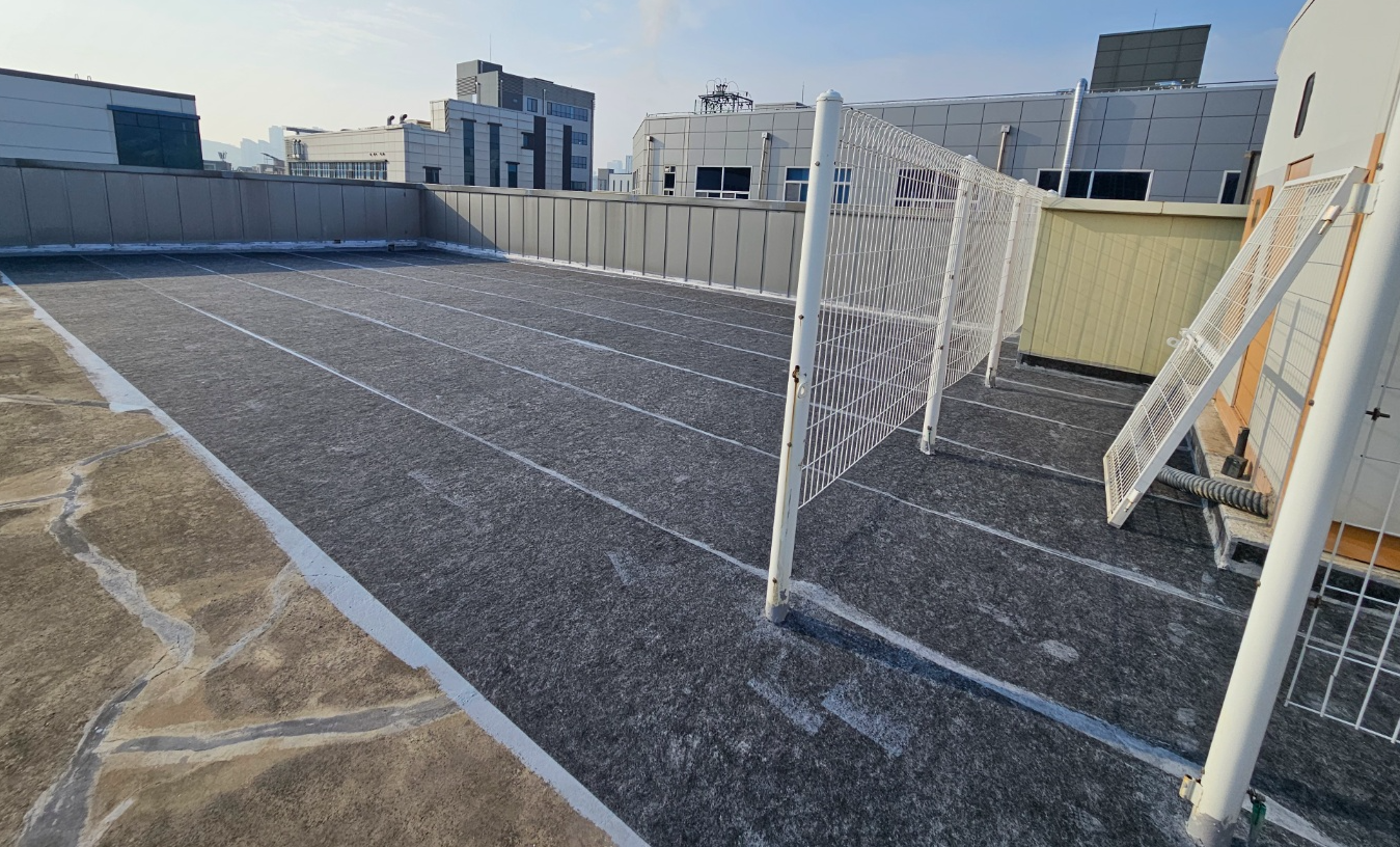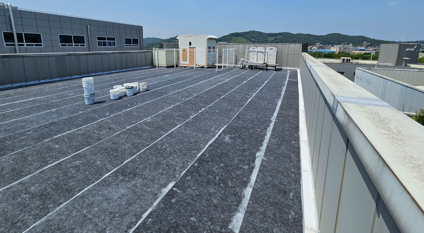 질긴 섬유 소재의 방수시트를 바닥 전체에 부착한 후 함침 작업을 진행합니다. 함침 작업은 옥상 바닥과 방수시트를 서로 일체화시키기 위한 작업입니다. 이래야 바닥에서 시트가 들뜨지 않아 하자가 발생하지 않습니다.