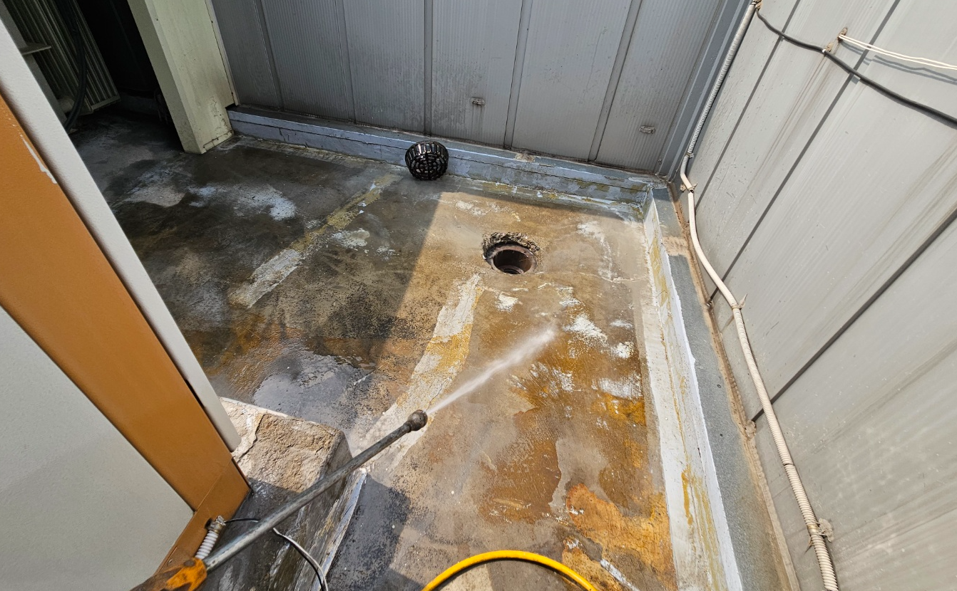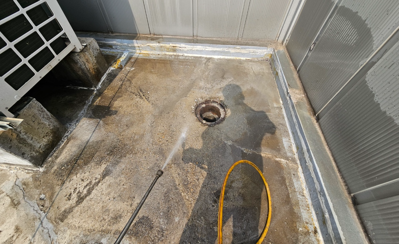 바닥을 깨끗하게 정리한 다음에는 물청소 작업을 진행합니다. 고압 세척기를 사용하여 옥상을 깨끗하게 청소하는 작업입니다. 바탕 정리 작업에 이어 물청소 작업까지 완료하면 본격적인 복합방수 시공 전의 밑작업이 끝나게 됩니다.