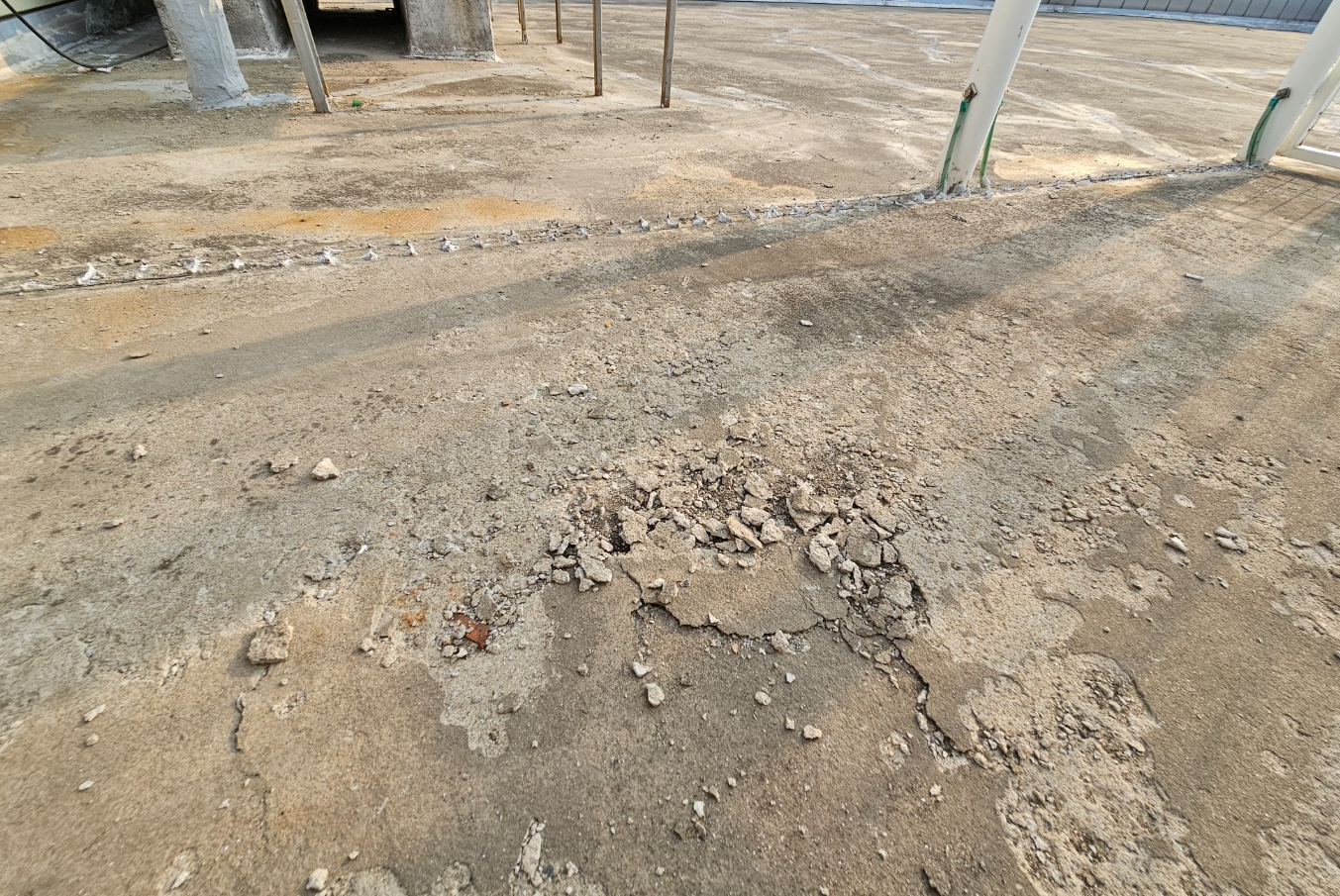 시공을 하기 전 옥상의 모습입니다. 콘크리트 바닥이 드러난 상태로 한눈에 보기에도 상태가 그리 좋지 않음을 알 수 있습니다. 복합방수를 시공하기 전에 우선 옥상 바닥을 깨끗하게 정리하는 것이 중요합니다.