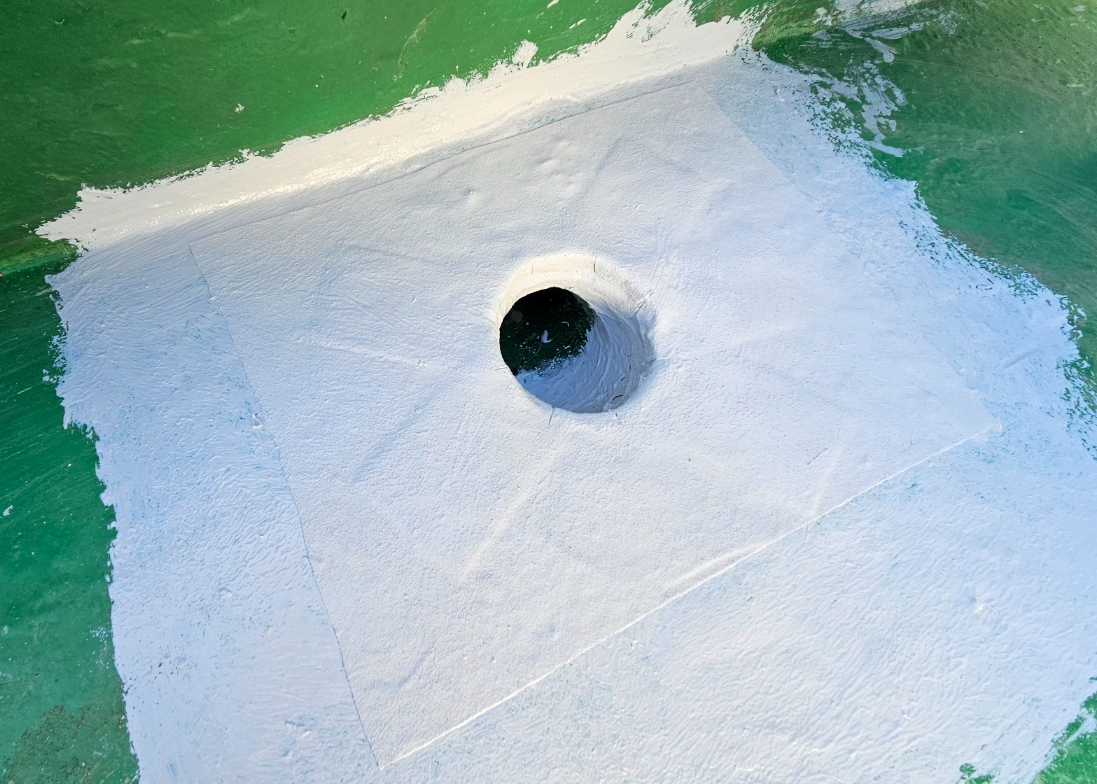 다음으로 우수관에도 마찬가지로 방수시트 밴드를 부착합니다. 다만 시공 부위에 알맞은 크기로 잘라 붙인 후 시트를 크게 덮어준다는 차이점이 있습니다. 조인트 부분과 우수관 모두 방수액을 칠한 후 시트를 부착하고 다시 방수액을 칠해 작업을 마무리합니다.