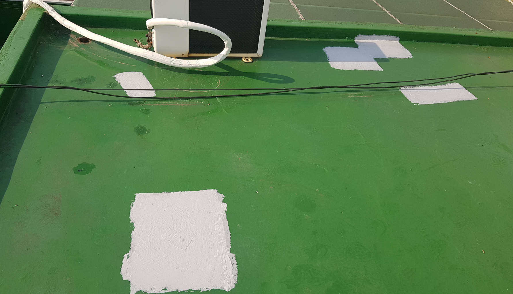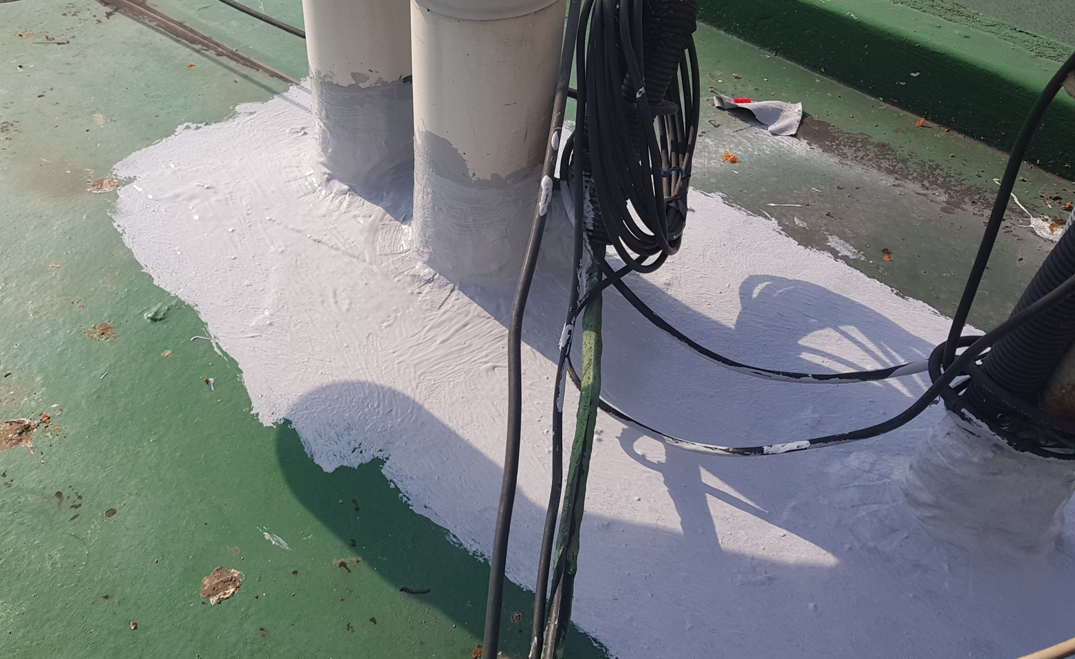 옥상 바닥이나 구조물에도 물론 시공이 가능합니다. 크랙이 생긴 부분에 방수액을 칠한 후 시트를 부착하합니다. 구조물이 있는 부분도 그 모양에 따라 시트를 잘라 붙여 작업을 진행합니다.