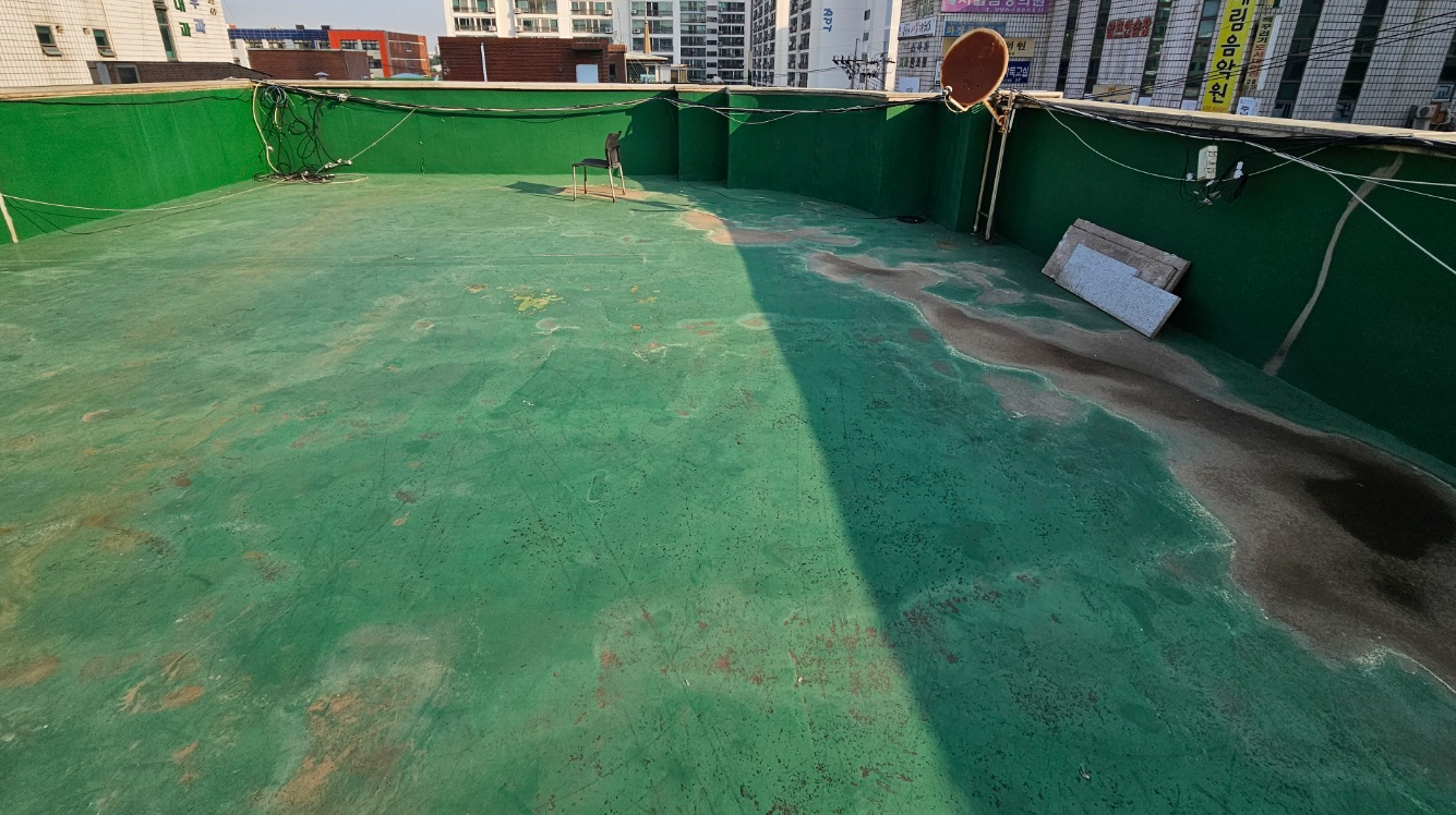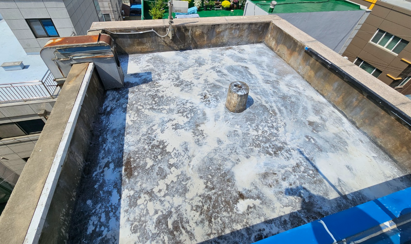 옥상에서 하자가 발생하는 부분은 대부분 우수관이나 조인트 부분입니다. 물론 바닥에도 크랙이 생깁니다. 판넬에도 지붕 자체가 녹이 슬어 하자가 발생하거나 배수로에 하자가 자주 발생합니다. 우선 시공 전에 밑작업으로 간단하게 바탕 정리와 물청소 작업을 진행합니다.