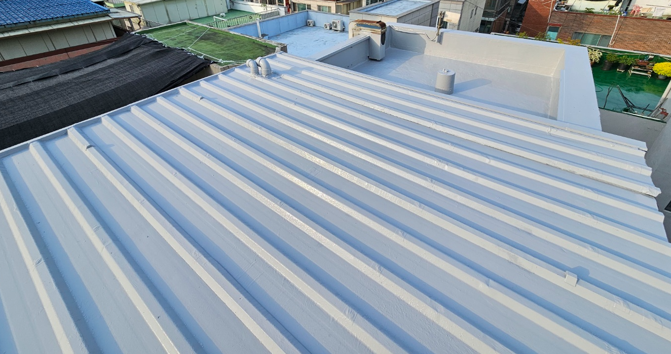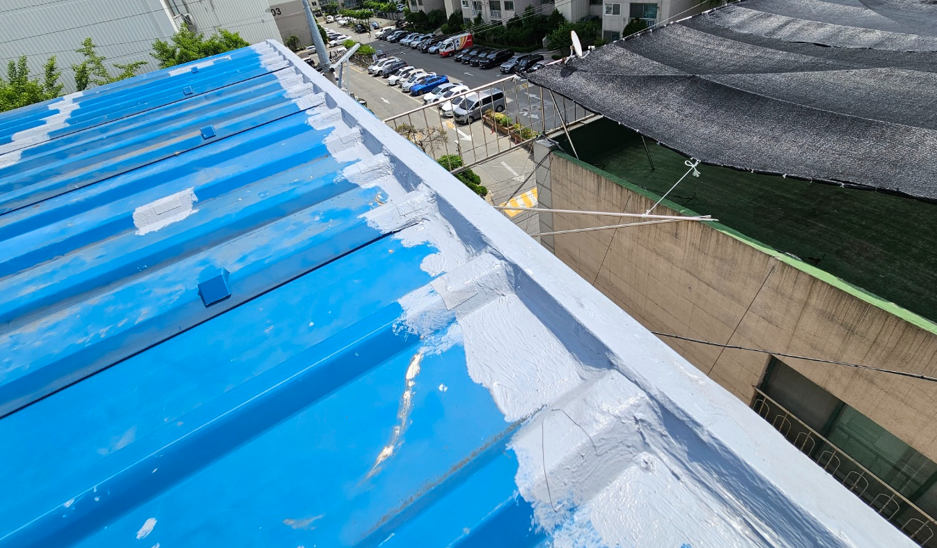 방수시트와 방수액 역시 방수자재로 활용합니다. 판넬에 구조물이 있는 부분이나 지붕 자체와 가장자리에 방수액을 칠한 후 방수시트를 부착하고 다시 방수액을 칠하는 작업입니다. 방수시트가 유연하기 때문에 어느 곳에나 부착할 수 있고 방수액 역시 호환성이 좋아 어디에든 사용이 가능합니다.