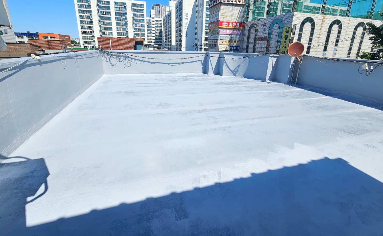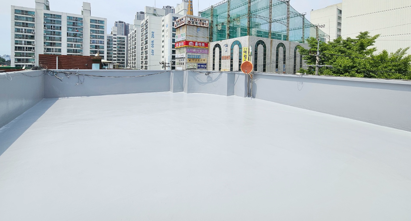 마지막 작업으로 상도를 진행합니다. 상도는 자외선을 차단하기 위한 작업입니다. 이렇게 한 번의 시공에도 많은 방수자재들을 사용합니다. 각 공정에 따라 알맞은 방수자재를 복합적으로 사용하면 방수 효과를 극대화시킬 수 있습니다. 이렇게 만든 옥상은 후에 상처가 나더라도 그 부분만 고쳐 계속해서 사용할 수 있습니다.