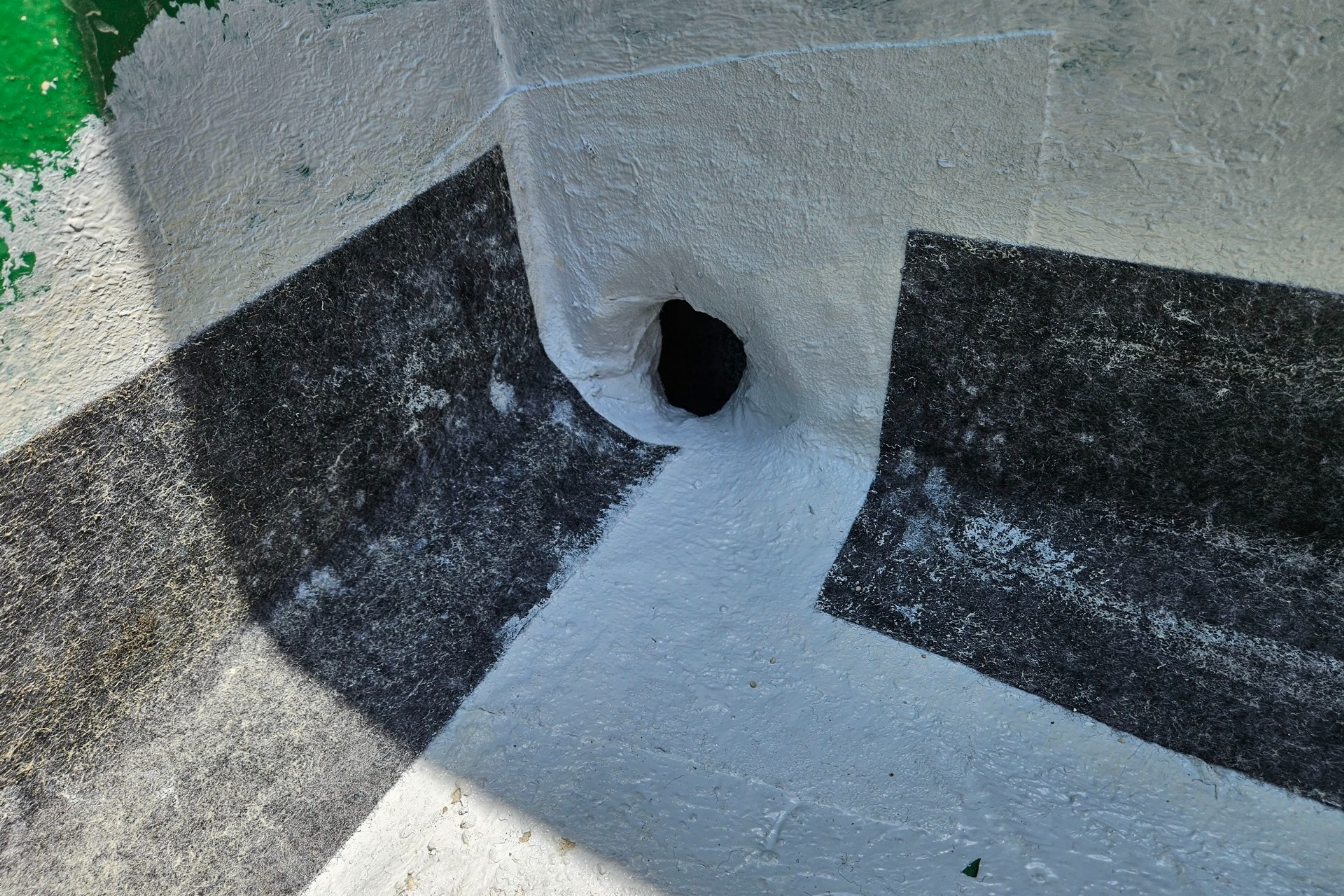하자가 자주 발생하는 우수관과 조인트 부분에도 마찬가지로 시트 작업을 진행합니다. 누수에 취약한 부분이기 때문에 바닥에 방수시트를 부착하기 전에 보강하기 위한 작업입니다. 벽체에 생긴 크랙에도 꼼꼼하게 방수시트를 부착하고 다시 방수액을 칠해 마무리합니다.