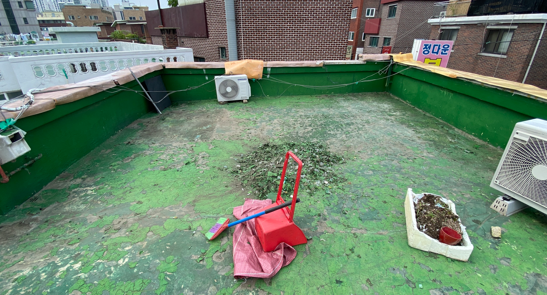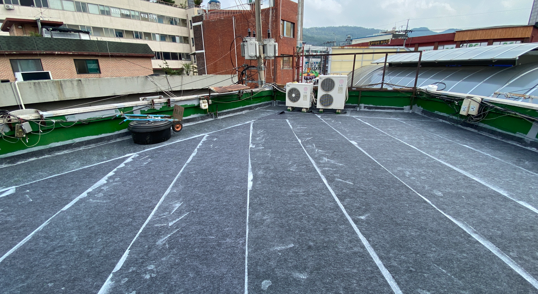 이렇게 옥상 방수의 모든 과정이 마무리됩니다. 방수액과 방수시트를 함께 사용하여 시공했기 때문에 우레탄만으로 작업했던 기존의 옥상과는 확연한 방수력의 차이를 느낄 수 있을 것입니다. 완공한 옥상은 반영구적인 방수 수명을 갖게 되며 하자 보증 기간은 6년으로 옥상에 작은 상처가 나더라도 그 부분만 고쳐 계속해서 사용할 수 있습니다.