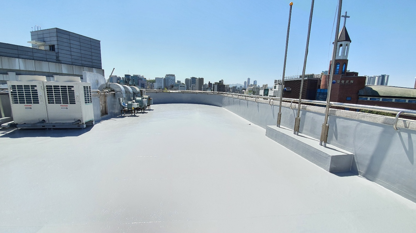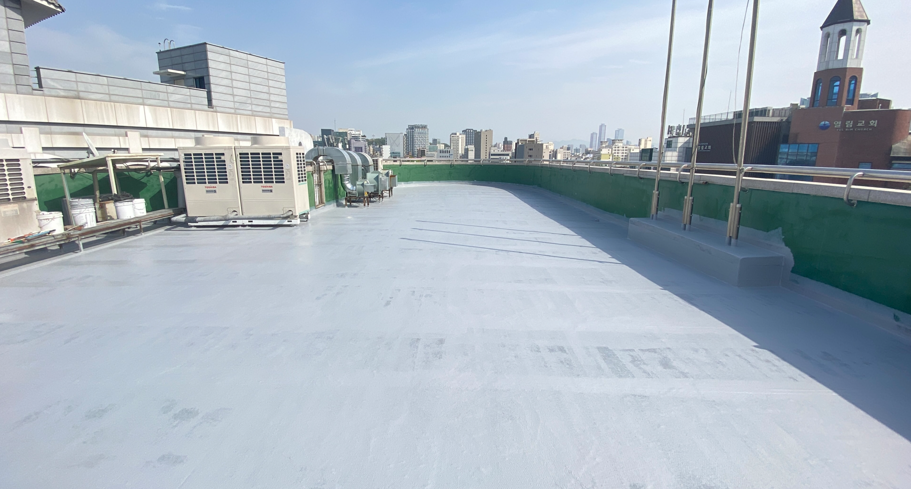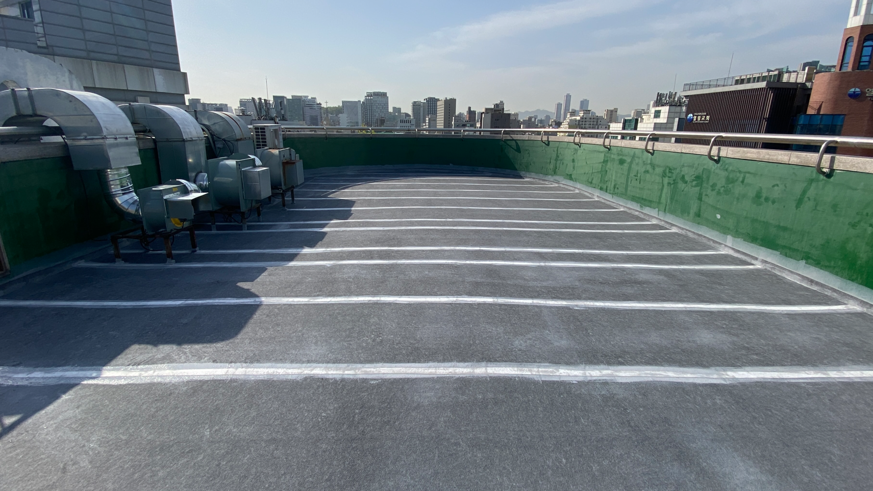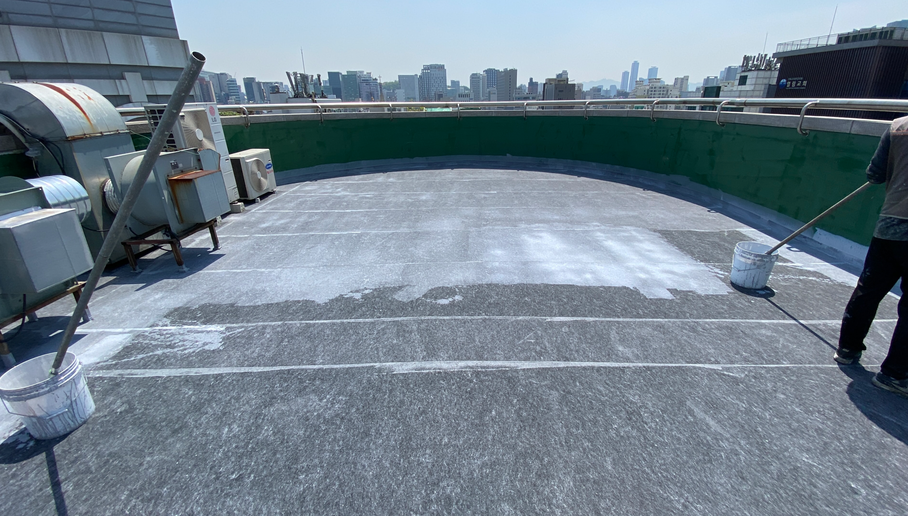 마지막으로 상도 작업을 진행합니다. 상도는 자외선을 차단하여 방수액을 보호하는 역할을 합니다. 옥상누수를 해결하기 위해서는 크랙을 해결하는 것이 중요합니다. 그리고 옥상의 크랙을 해결하기 위해서는 방수액만으로는 힘들기 때문에 방수시트를 함께 사용하는 것이 좋습니다. 완공된 옥상은 이후 관리가 잘 이루어진다면 반영구적으로 사용할 수 있습니다.