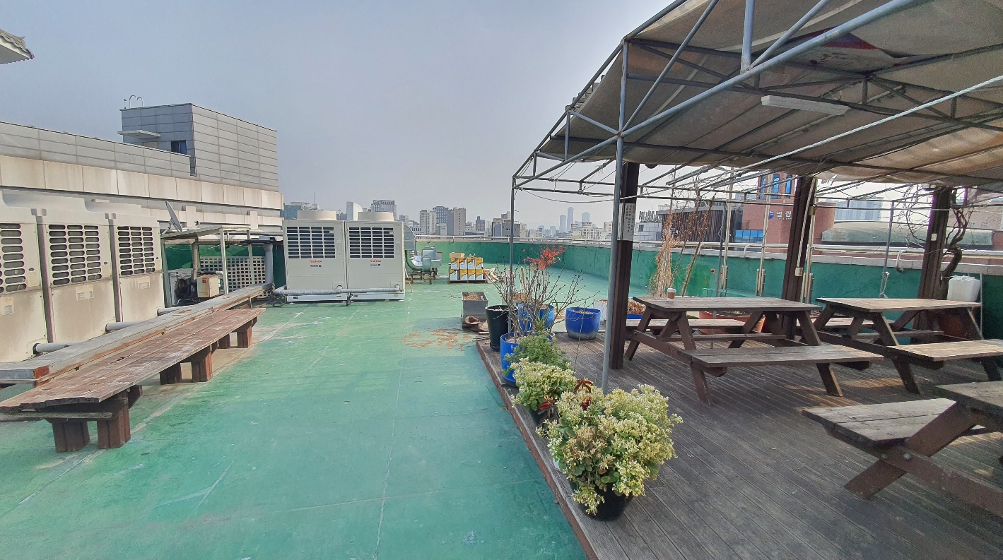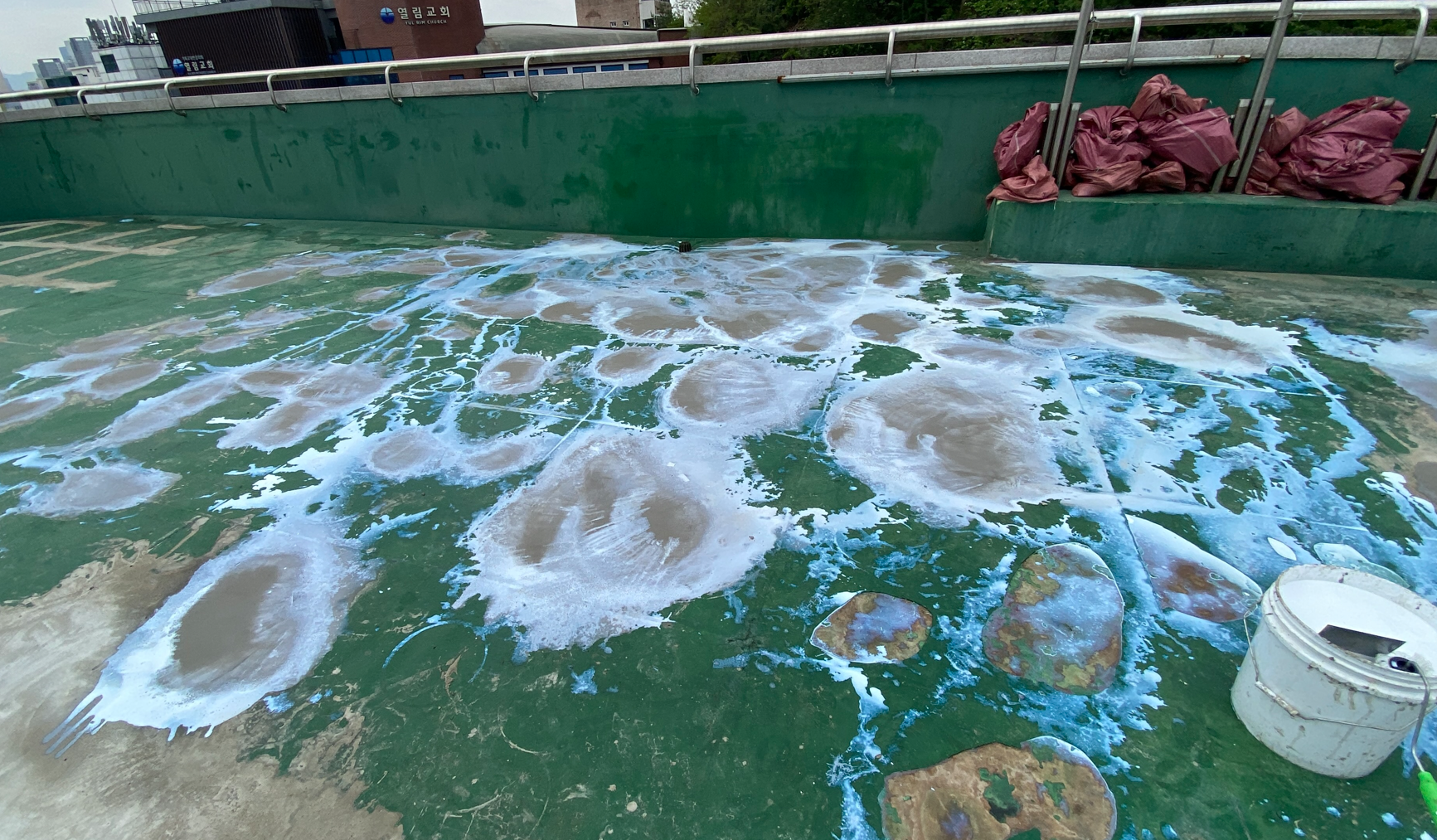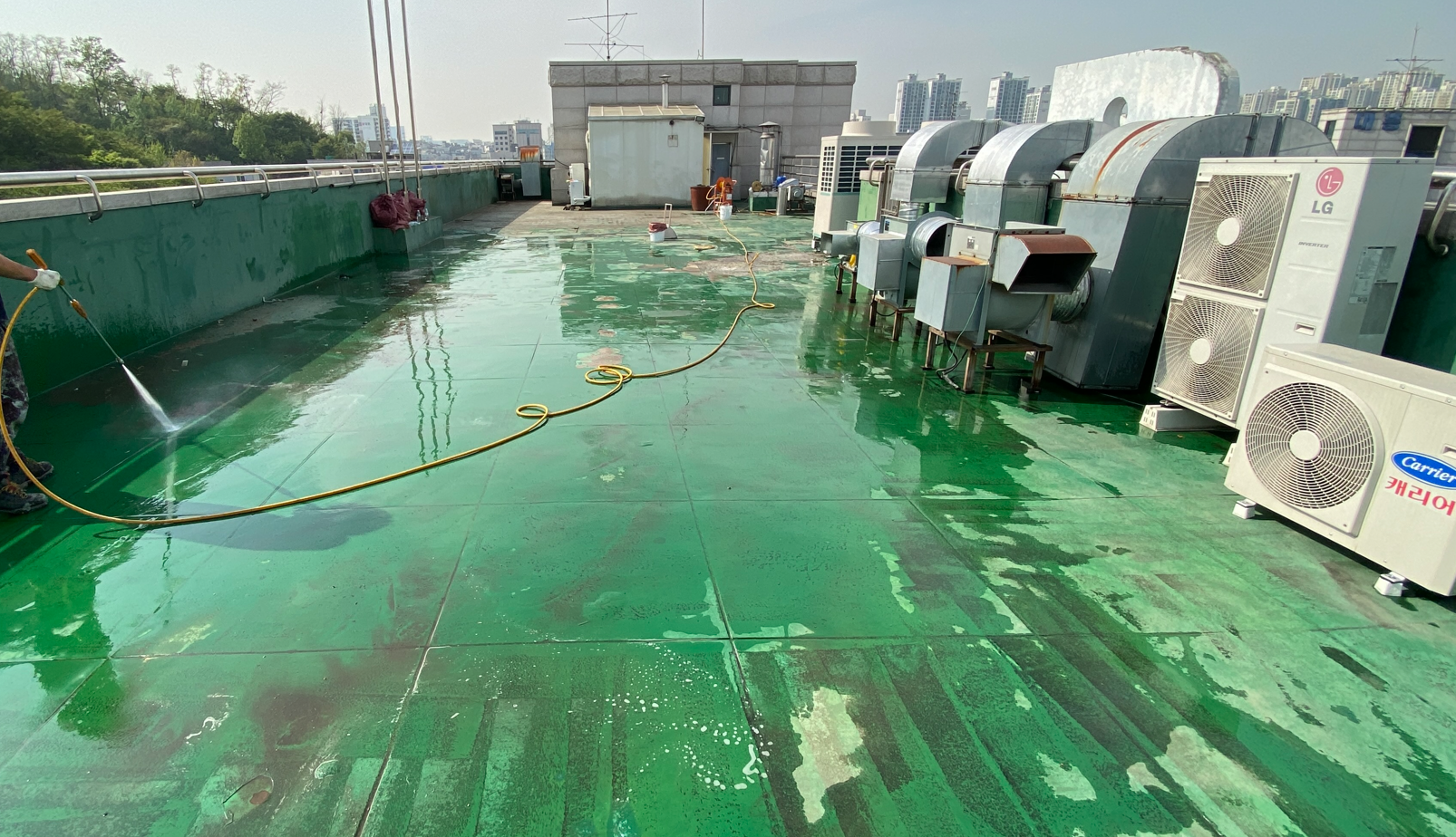 바닥 정리를 마친 후 물청소 작업에 들어갑니다. 옥상에 쌓인 먼지와 각종 이물질을 제거하기 위한 작업으로 고압 세척기를 사용해 작업합니다. 바닥 정리와 물청소 작업을 마치면 본격적인 시공 전의 밑작업이 마무리됩니다.