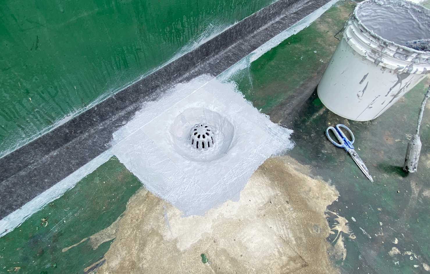 누수가 자주 발생하는 우수관과 벽체 조인트 부분에는 기초 시트 작업을 진행합니다. 누수에 취약한 부분을 보강하기 위해 방수액을 칠하고 방수시트를 부착하는 작업입니다. 방수액을 칠한 후 방수시트를 부위에 알맞게 부착합니다.
