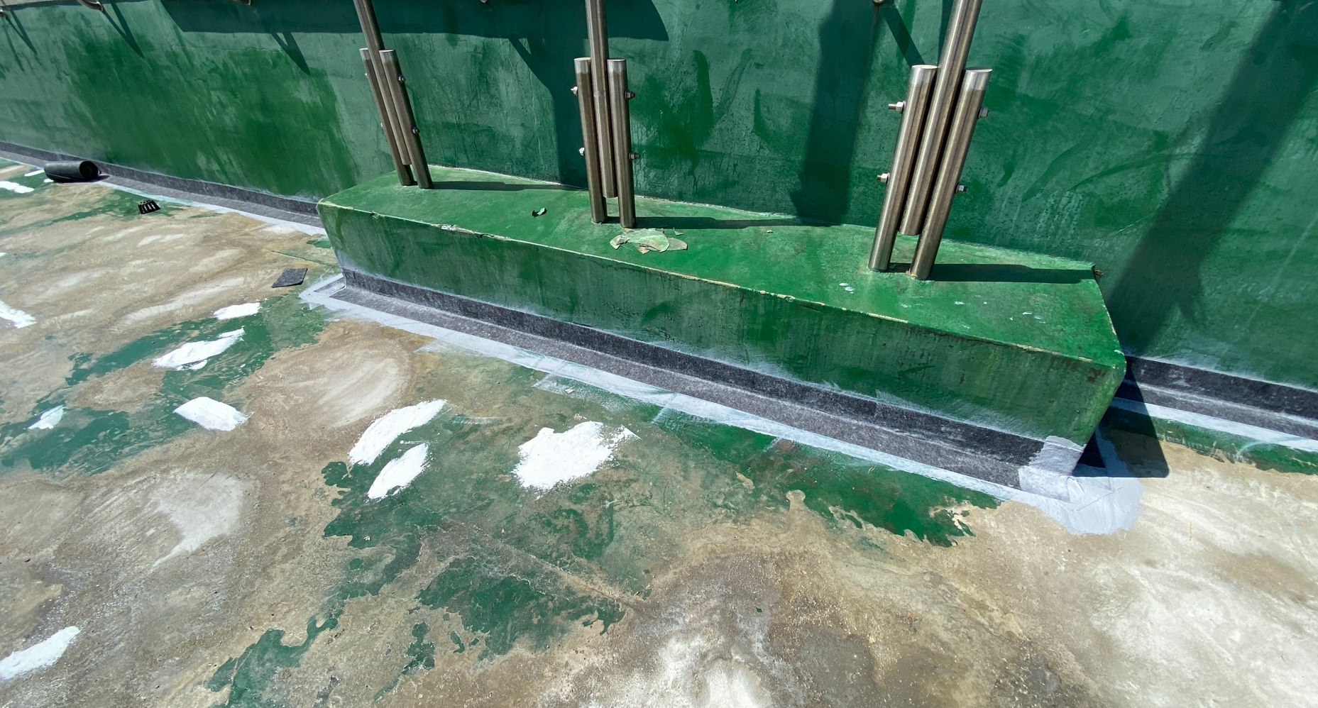 옥상 바닥에 있는 십자 모양의 홈과 단차가 있는 부분에는 미장 작업을 진행합니다. 바닥을 평탄화하여 이후의 방수시트 작업을 조금 더 원활하게 작업하기 위한 작업입니다. 미장은 몰탈과 침투 방수액을 혼합한 것으로 작업을 진행합니다.