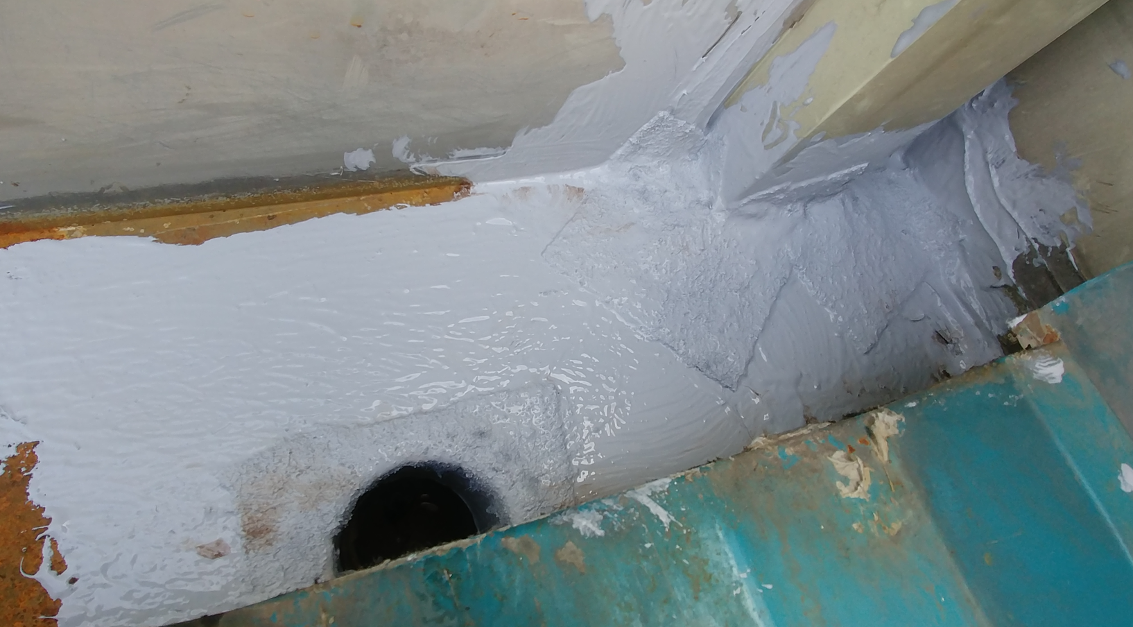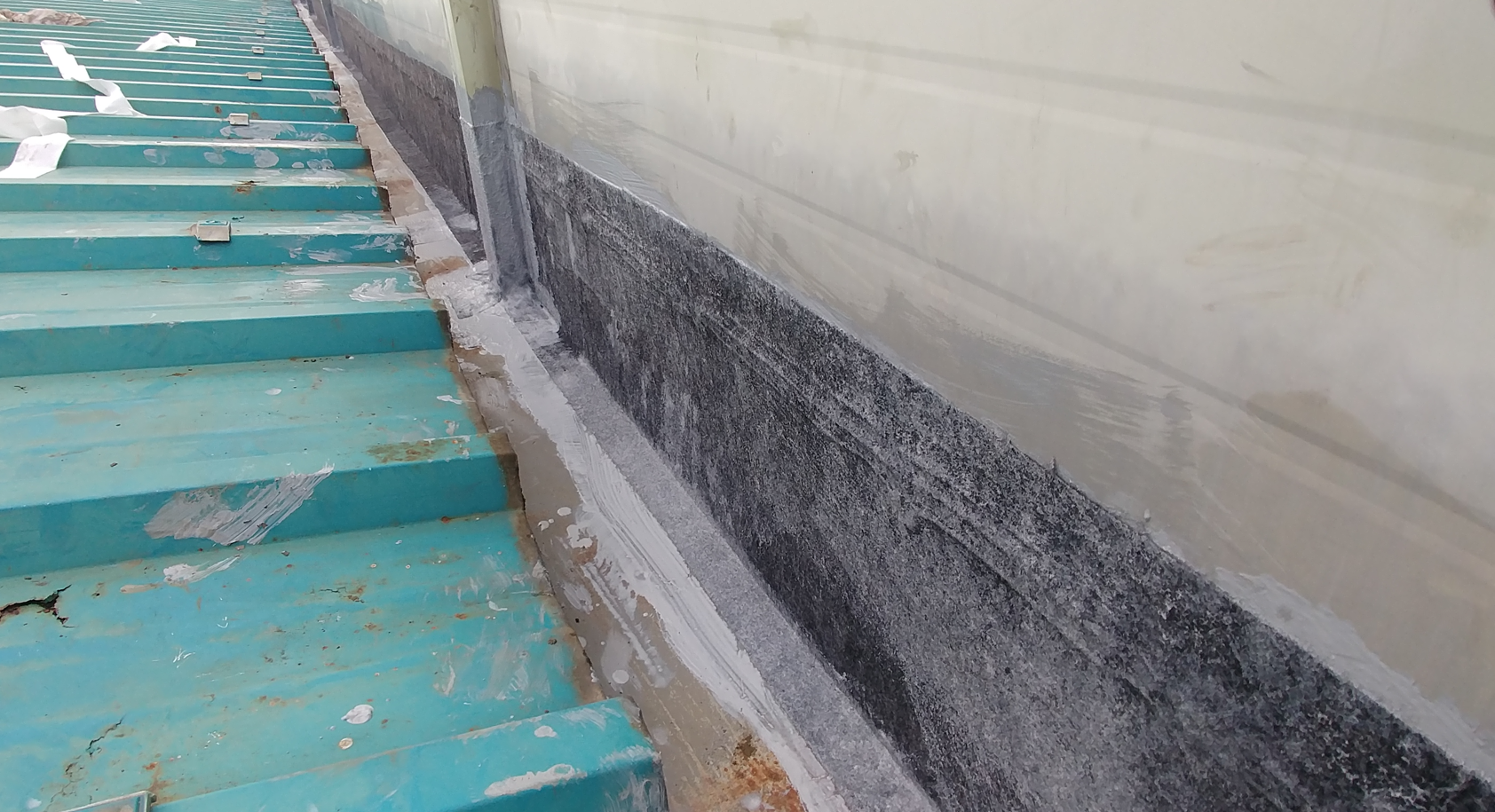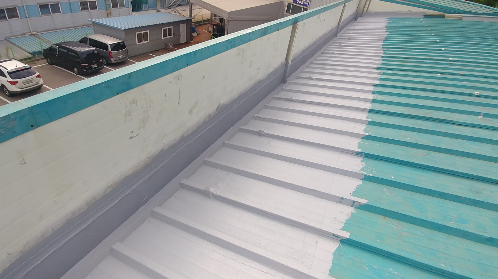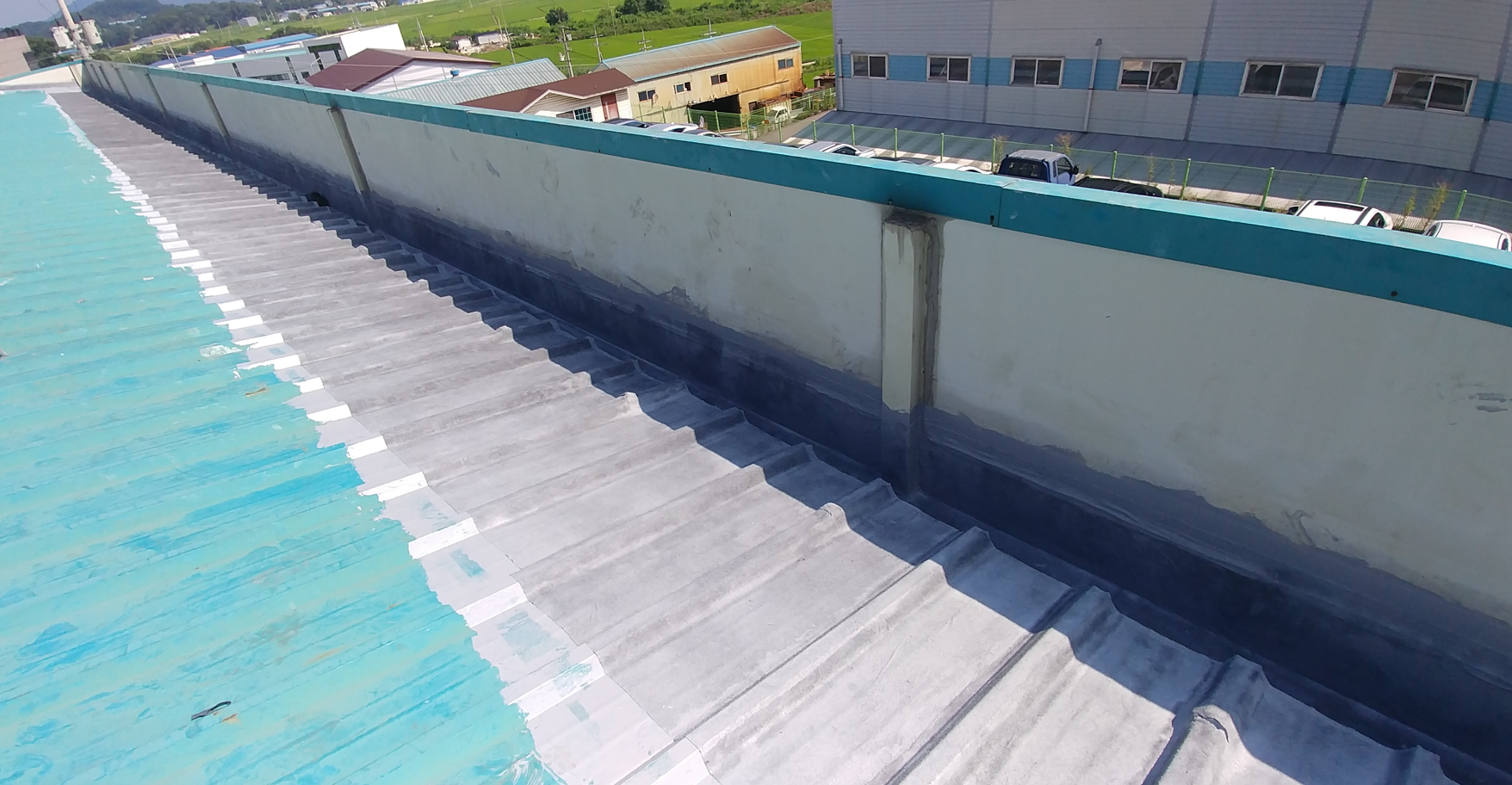 마지막으로 상도를 진행합니다. 상도는 자외선을 차단하여 방수층을 보호하기 위한 작업입니다. 샌드위치판넬의 하자를 해결하기 위해서는 이렇게 방수시트로 크랙을 확실하게 잡은 후 방수액을 칠해 방수층을 만드는 것이 좋습니다.