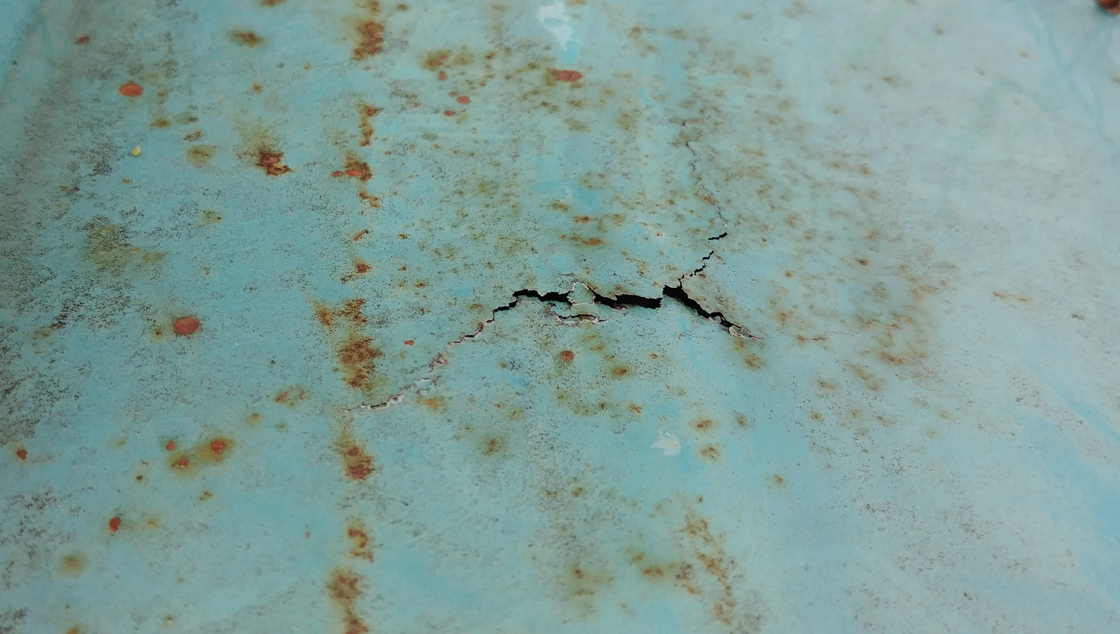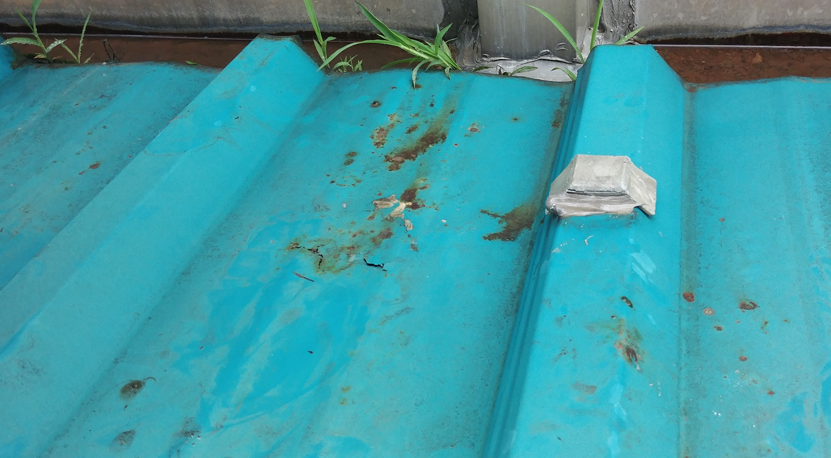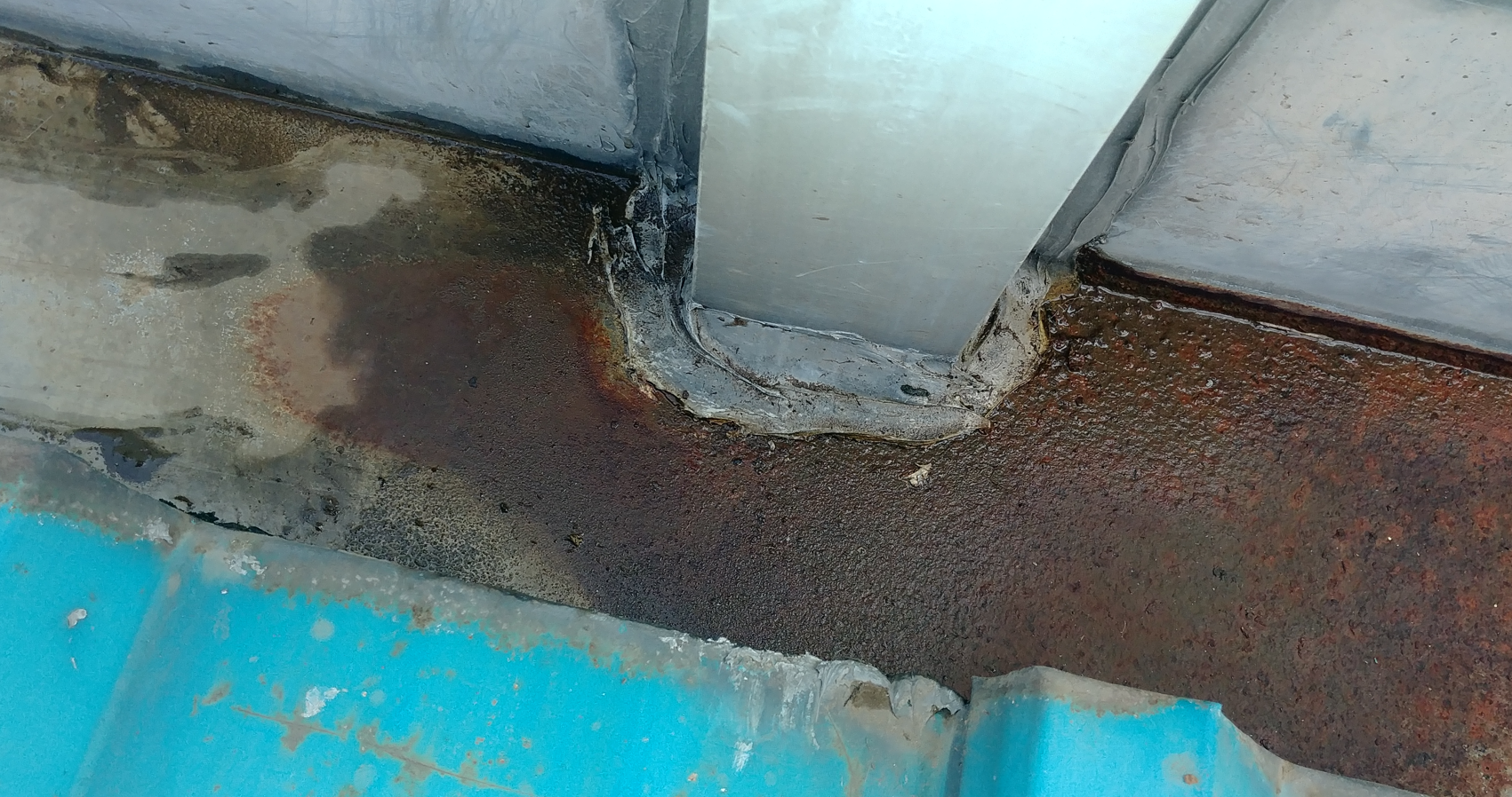 샌드위치판넬 지붕에 녹이 슬어 하자가 발생한 모습입니다. 지붕이 갈라진 부분에 방수시트를 부착하여 확실하게 고정하고 방수액을 칠해 보수해야 합니다.