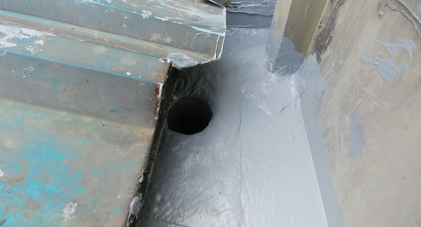 샌드위치판넬 배수로에 하자가 발생한 모습입니다. 배수로의 이음새에 실리콘으로 보수를 한 흔적을 볼 수 있습니다. 앞서 말씀드린 대로 실리콘은 하자를 해결할 수 없기 때문에 지붕과 마찬가지로 방수액과 방수시트를 사용할 것입니다.